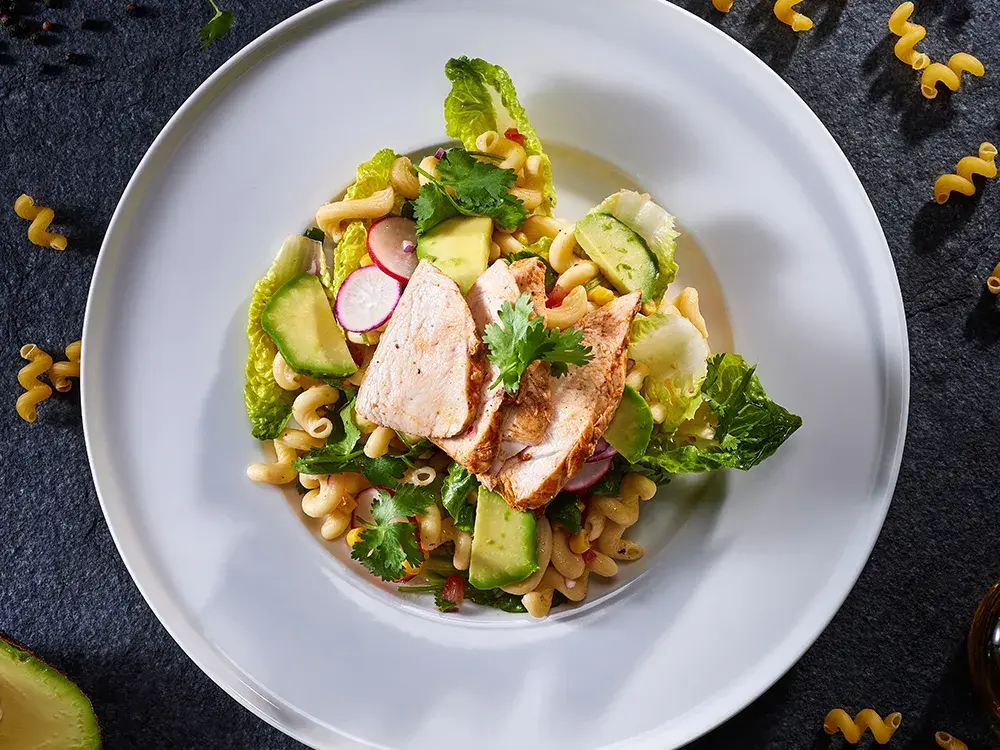 Došla vám inspirace, co připravit k večeři nebo k obědu, a potrpíte si na dobré těstoviny? Recept na salát s cavatappi, kuřecím masem marinovaným v chipotle, avokádem, baby gem salátem, kukuřicí, koriandrem a rajčatovo-chilli salsou vám jistě přijde vhod!