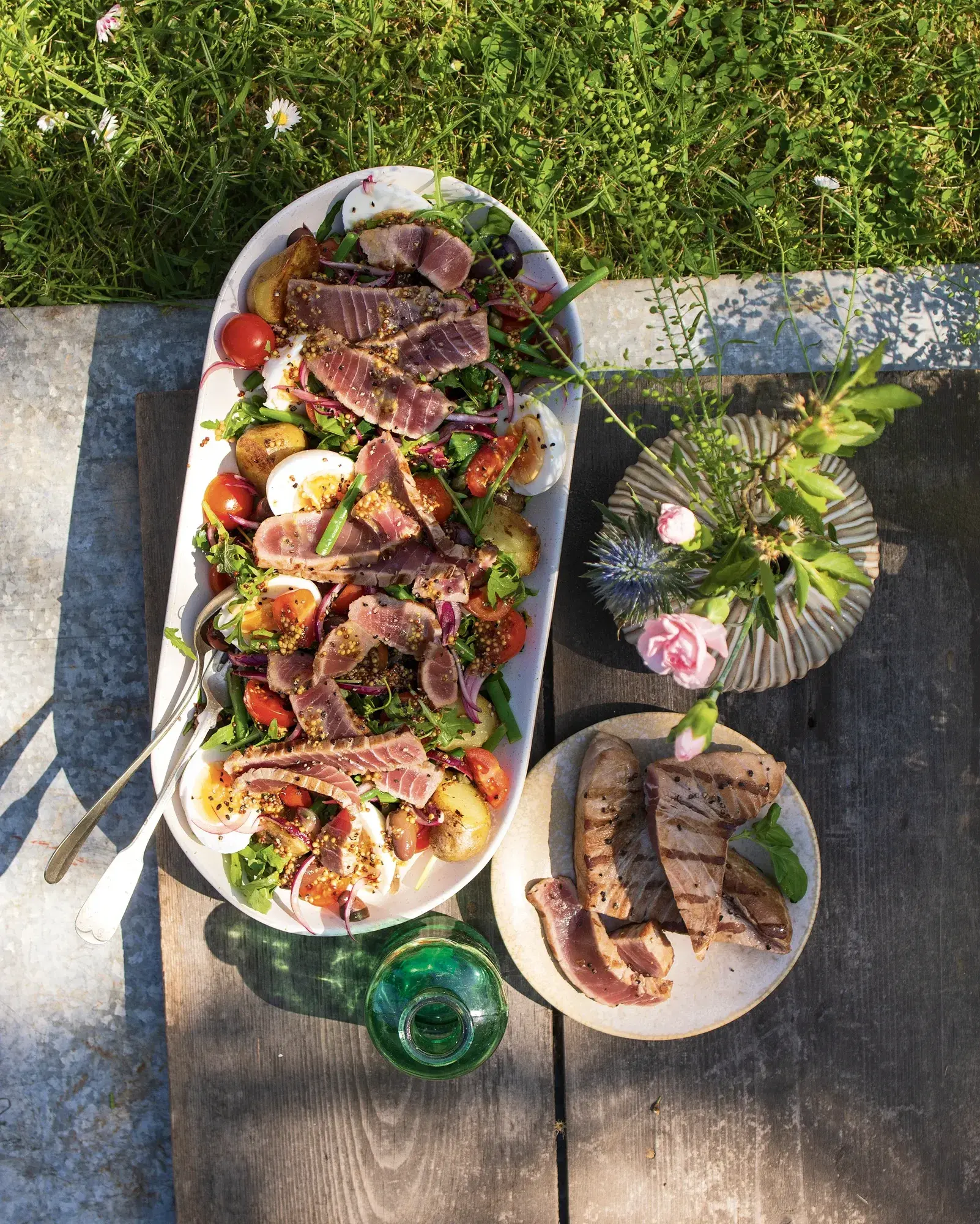 Ve slavném salátu Niçoise pocházejícím z francouzského města Nice se nejčastěji setkáte s konzervovaným tuňákem. I když jde o lahodnou verzi, luxusní varianta s čerstvou rybou a grilovanými bramborami vás dostane do kolen.