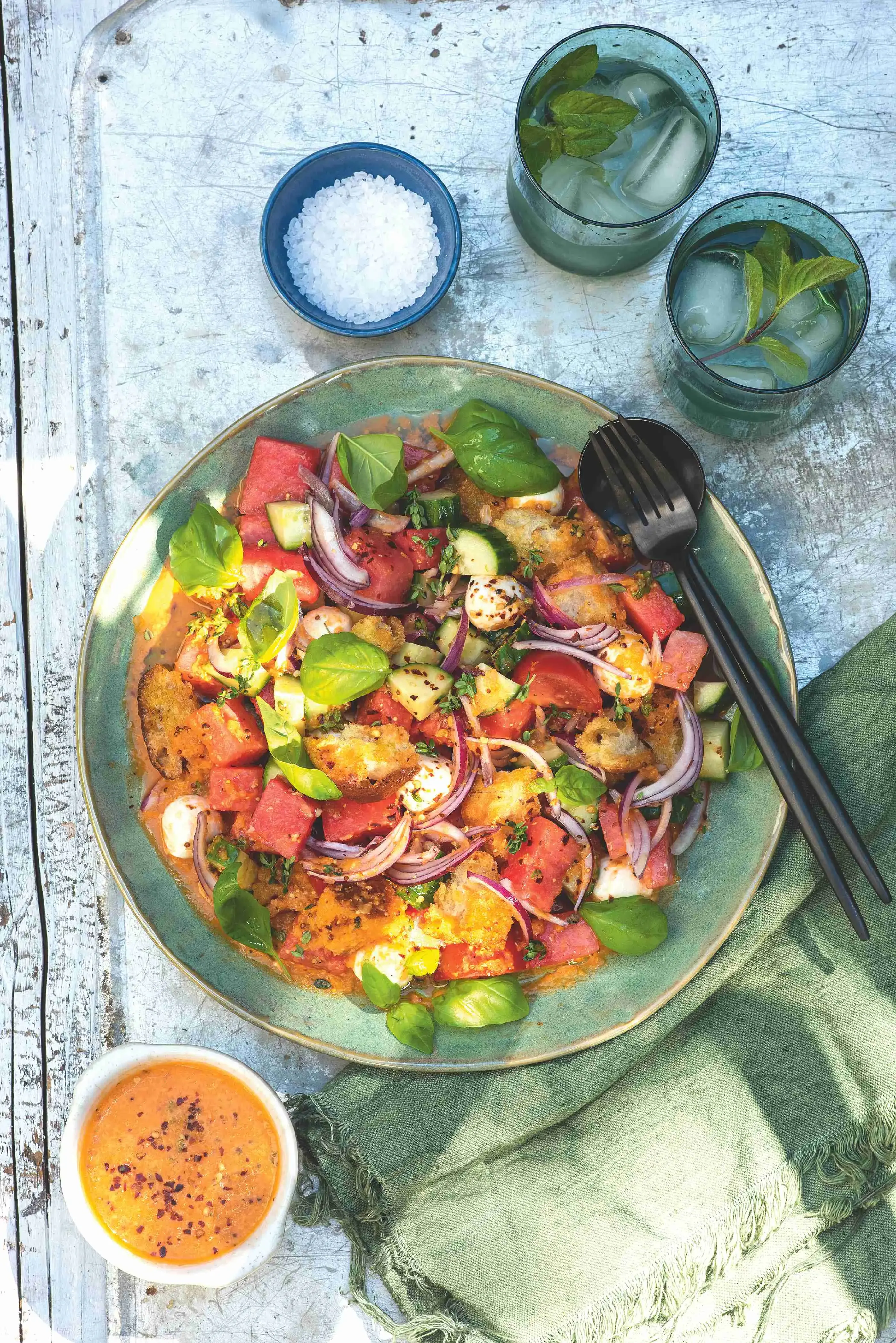 Klasický rajčatový salát panzanella jsme obohatili o meloun, který z něj udělal letní pecku. Sladkost a šťavnatost melounu ještě více vynikne, když jej budete podávat posypaný krystalky kvalitní soli nebo i trochou chilli! Tahle varianta salátu panzanella je chuťově vynikající, o zbylou zálivku jsme se při focení přetahovali.