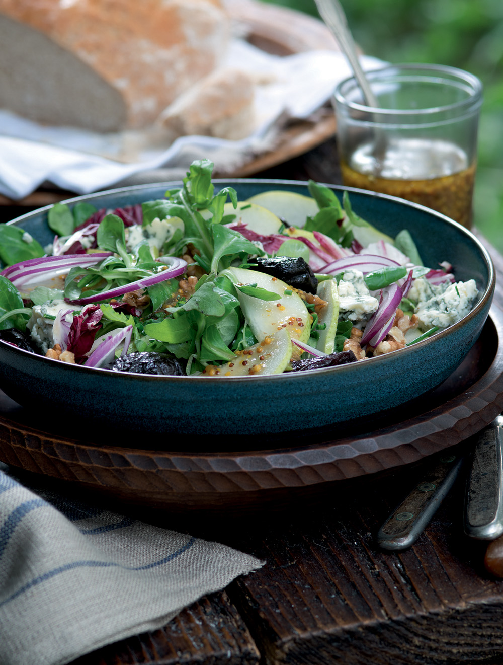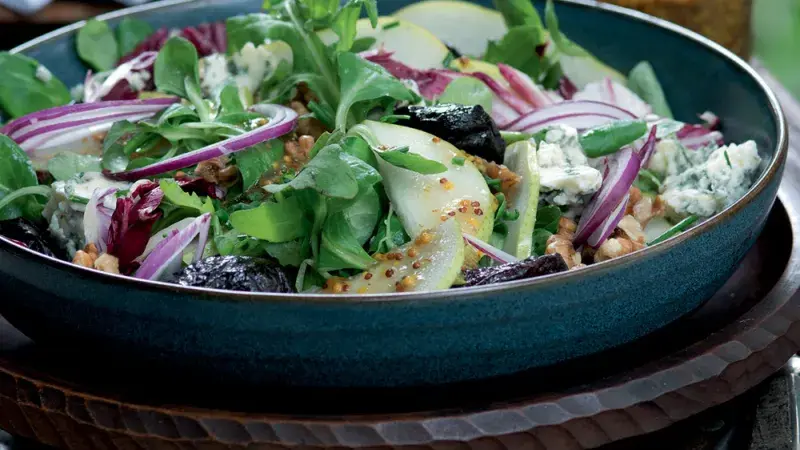 Salát buď snězte hned, nebo hrušky pokapejte citronovou šťávou, aby na vzduchu nezačaly hnědnout.