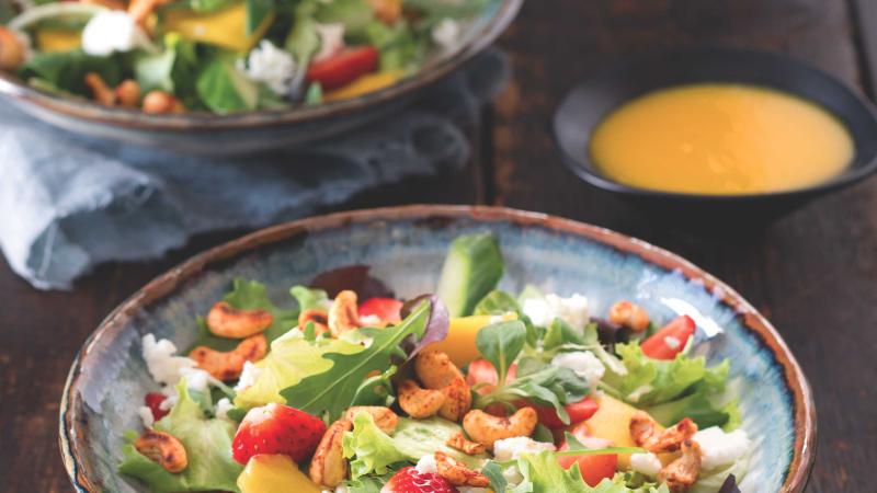 Kombinací salátu s jahodami existuje nespočet. Tentokrát jsme sladké šťavnaté plody doplnili křupavými oříšky a slaným sýrem. Jednoduchá zálivka z ovocného freshe a másla vás mile překvapí!
