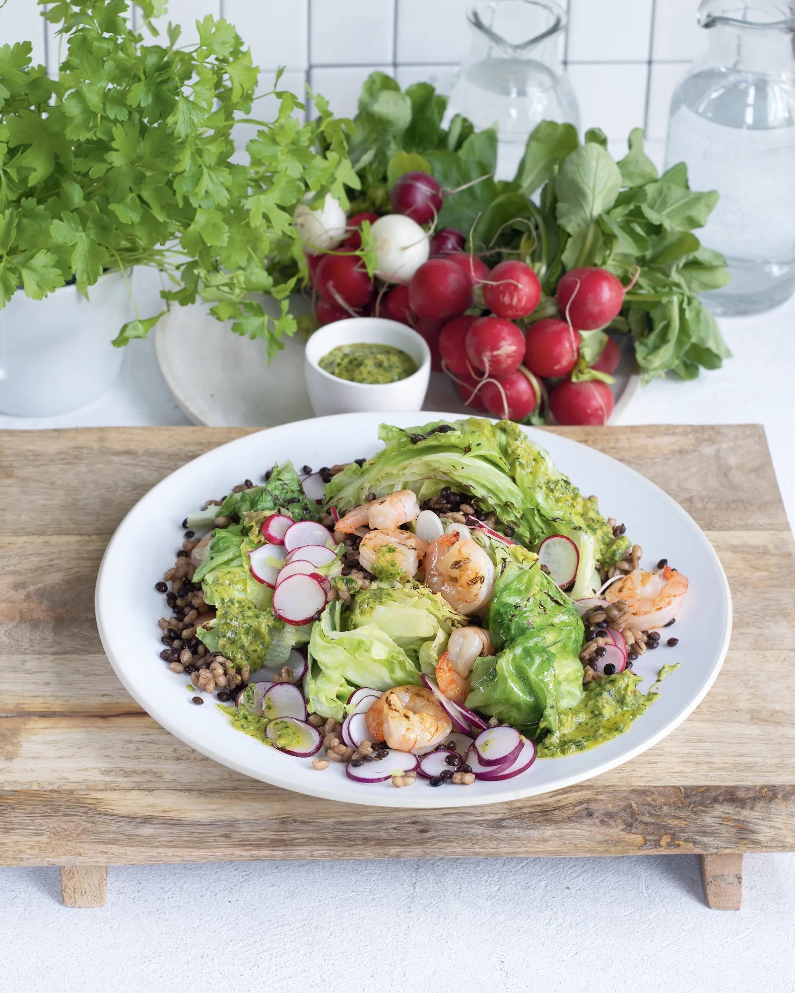 Salát s krevetami a ředkvičkami – lehký, barevný a chuťově výrazný salát, který zvládnete během chvilky a přitom působí jako z prvotřídní restaurace. Grilovaný salát získá jemně kouřovou chuť, krevety a obiloviny jej krásně doplní. Ideální jarní jídlo – svěží, vyvážené a plné textur.