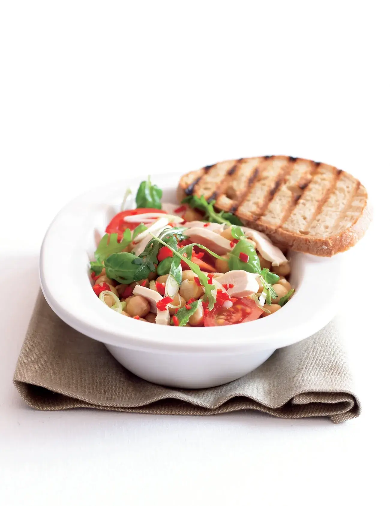 Pošírované kuře zkuste přidat do salátu s cizrnou, cibulkou a rajčaty. Vše krásně doplní máta, bazalka a pikantní zálivka.