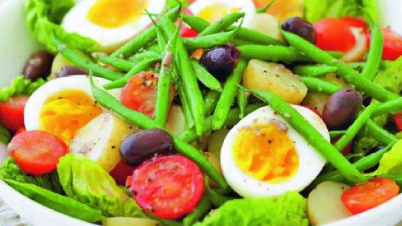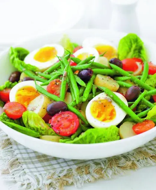 Skvělý salát z brambor, fazolek a černých oliv podávejte nejlépe se sklenkou bílého vína.
