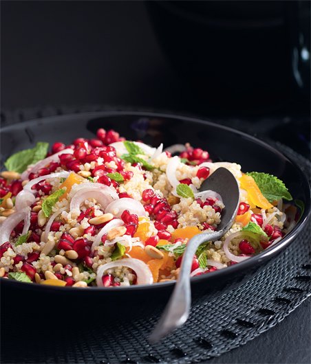 Granátové jablko je do salátů jako stvořené, dodá jim parádní nakyslou chuť a rozehraje v nich barevný koncert. Dobře se kombinuje nejen s quinoou, ale také s bulgurem nebo kuskusem.