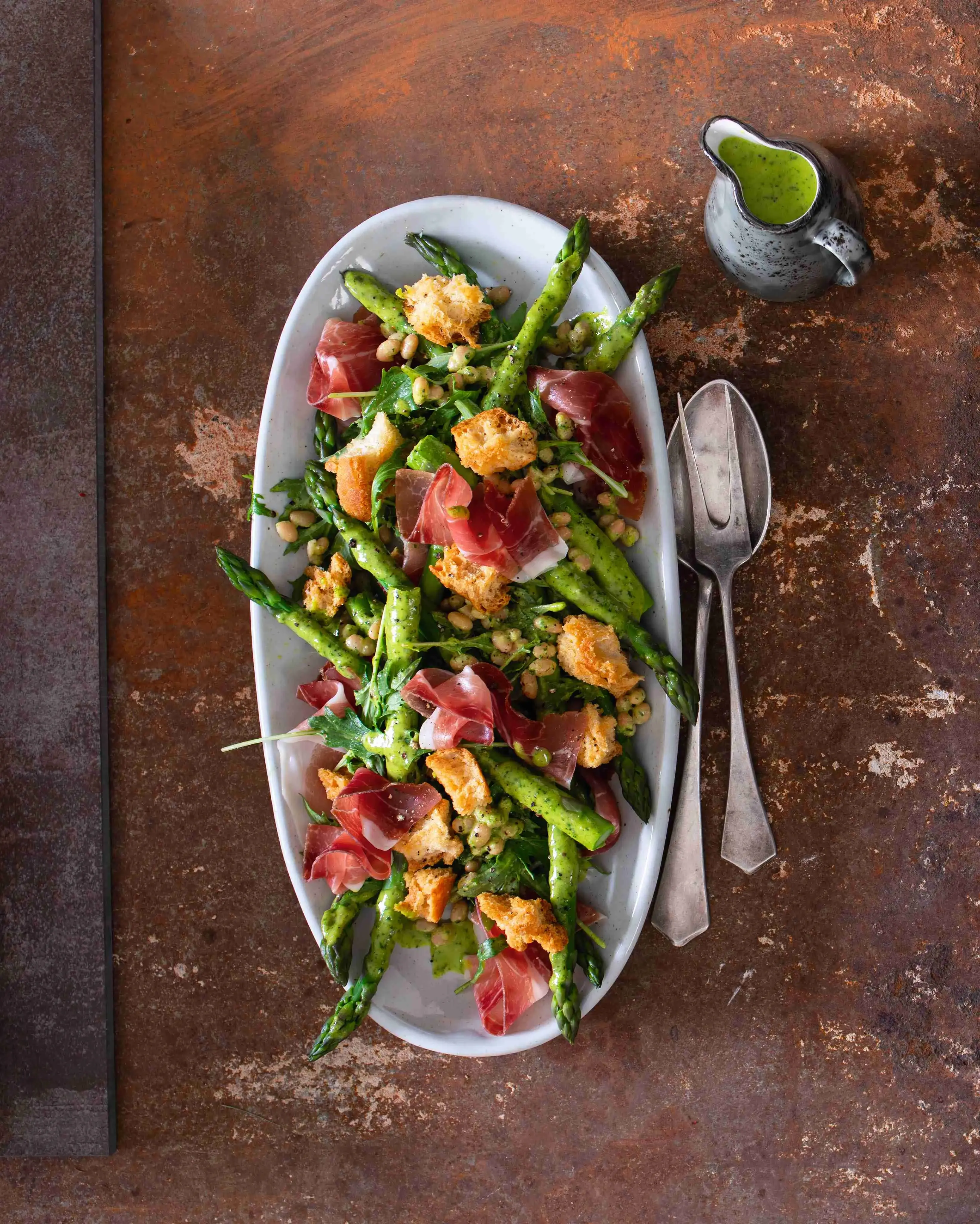 Salát inspirovaný francouzskou gastronomií vám učaruje jednoduchostí, promyšlenými kontrasty textur i vyladěním chutí. Prim v něm přitom hrají pouze 4 suroviny – zelený chřest, sušená šunka, bílé fazole, křupavé krutony. Ovšem bylinková zálivka je oním pomyslným esem v rukávu, které vše dokonale propojí.