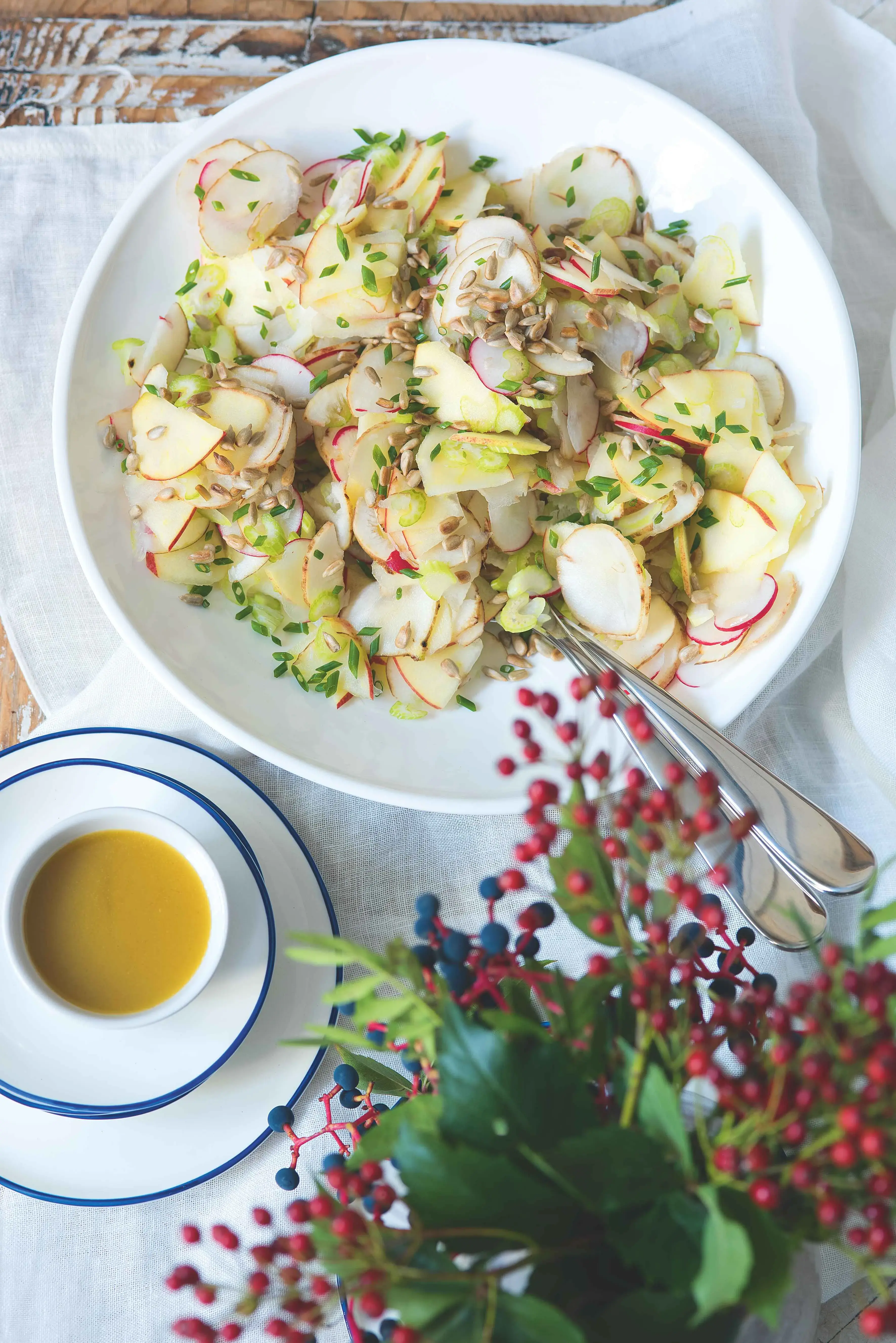 Topinambury zasyrova jsou křupavou lahůdkou s delikátní chutí. Spolu se sladkostí jablek, pikantní chutí ředkviček a svěžestí řapíkatého celeru salát krásně odlehčí i těžší menu.