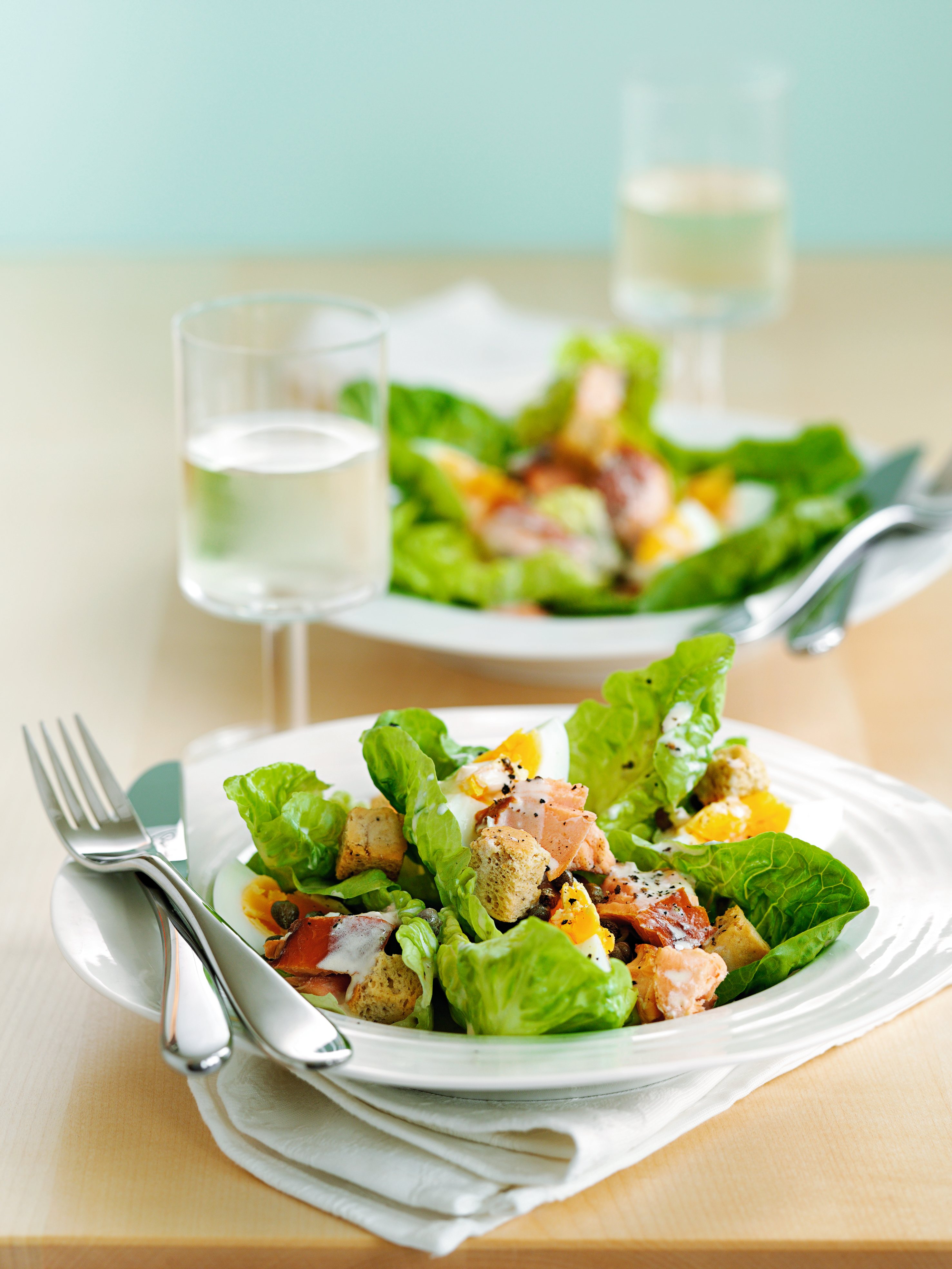 Uzený losos udělá z obyčejného salátu skvělou večeři nebo rychlý a lehký oběd. Je plný zeleniny a sytící pocit dodají také vařená vejce. Zálivku můžete použít už hotovou, nebo si ji připravte podle našeho receptu. Salát s uzeným lososem a vejcem je bezva letní jídlo plné vitamínů.