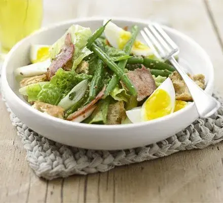 Salát s vejci, slaninou a fazolkami, který není příliš kalorický, přesto zasytí celou rodinu. Místo slaniny můžete použít kousky pečeného kuřete z předešlého dne nebo tuňáka v konzervě.
