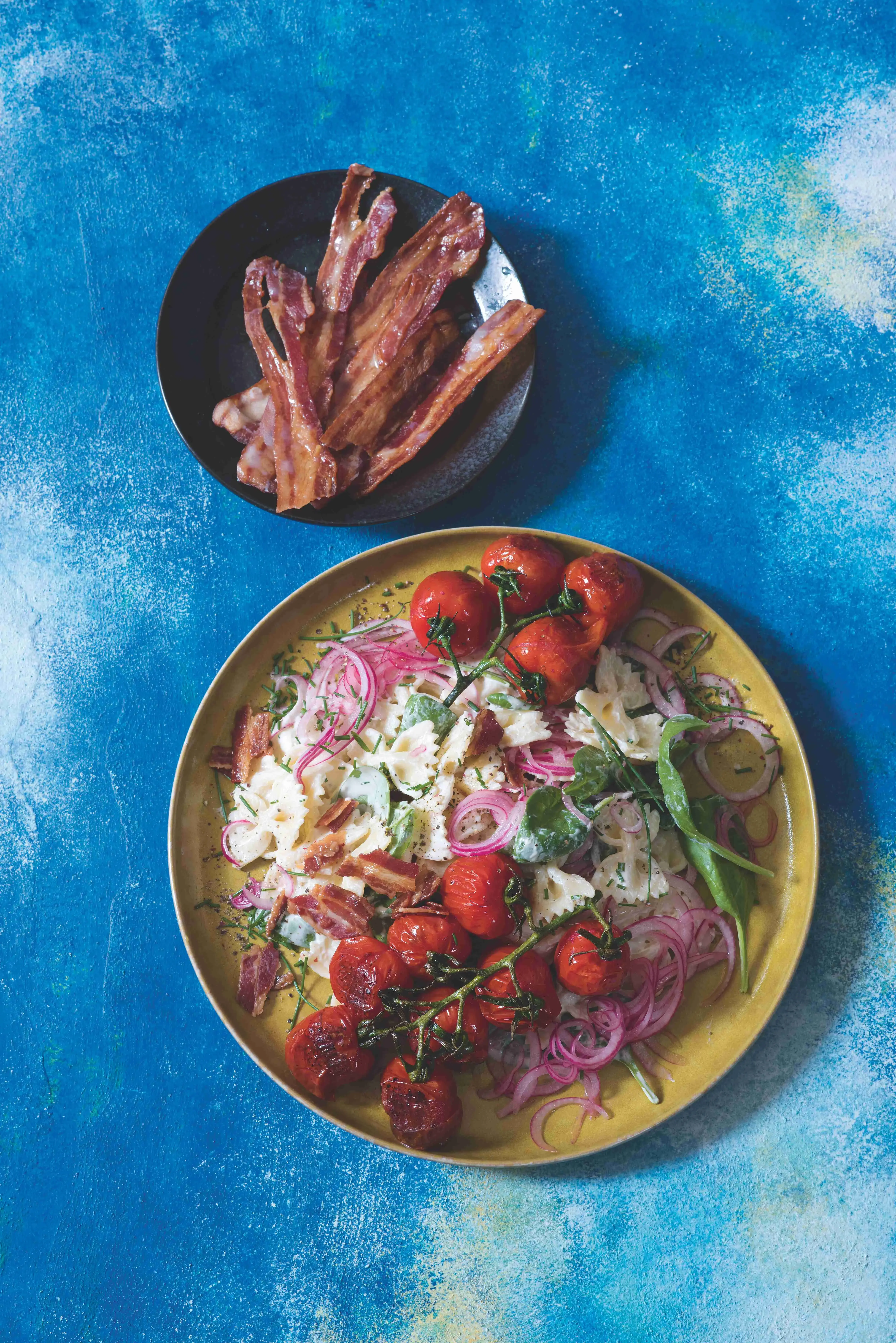 Osvědčená kombinace opečené slaniny, špenátu a rajčat funguje i v těstovinovém salátu. Jemný dresink ze zakysané smetany s majonézou a hořčicí všechny chutě krásně podtrhne.