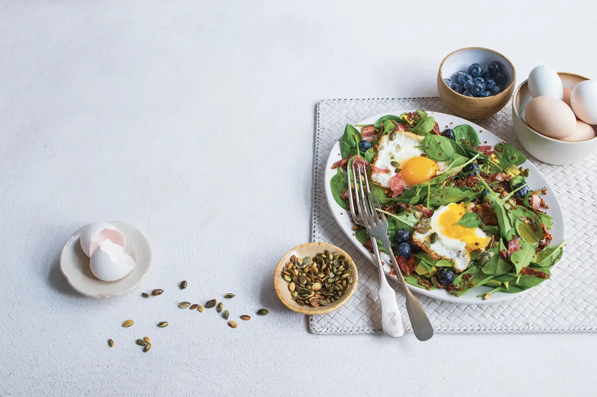Nachystat sytou a přitom zdravou večeři není nic náročného. Stačí čerstvé lupení (v našem případě špenát), oříšky, nějakou obilninu (my použili quiou) a vše spojit jednoduchou medovou zálivkou. Jako sytící prvek jsme zvolili vejce. A křupavá slanina je tou pověstnou třešničkou, bez které se náš salát z baby špenátu neobejde!