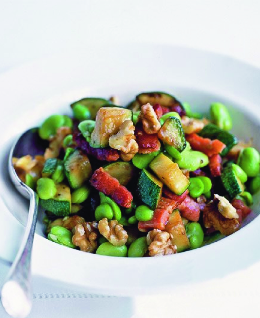 Připravte si salát z netradičních ingrediencí. Opečte pancettu, cuketu a na závěr posypte oříšky.