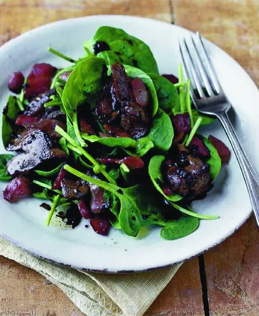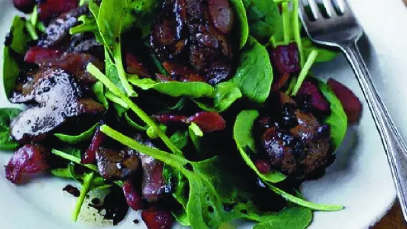 Baby špenát s voňavou anglickou slaninou, jatýrky a spoustou bylinek. Lehká večeře.
