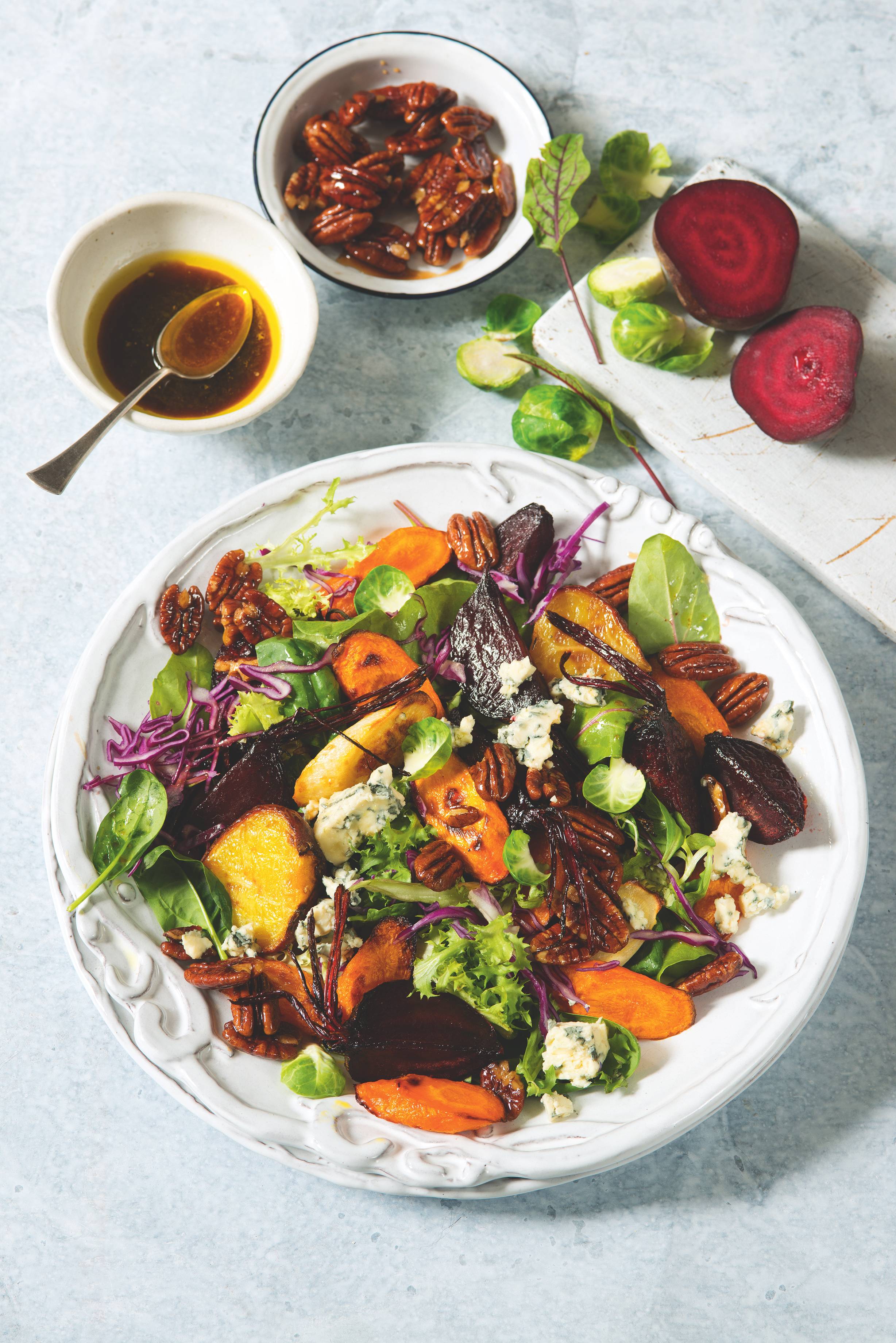 Salát z pečené kořenové zeleniny a červené řepy je skvělý recept na podzimní jídlo, které nejen zasytí, ale také vám dodá tolik potřebné živiny. Zkaramelizované pekanové ořechy salátu vtisknou neopakovatelnou chuť, díky níž salát s červenou řepou z vaší paměti jen tak nevymizí.