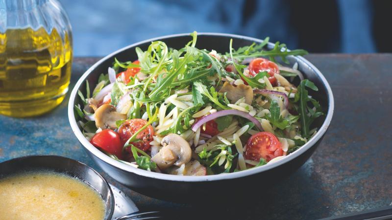 Salátová variace na věčné italské téma: rajčata, bazalka, rukola a – těstoviny.