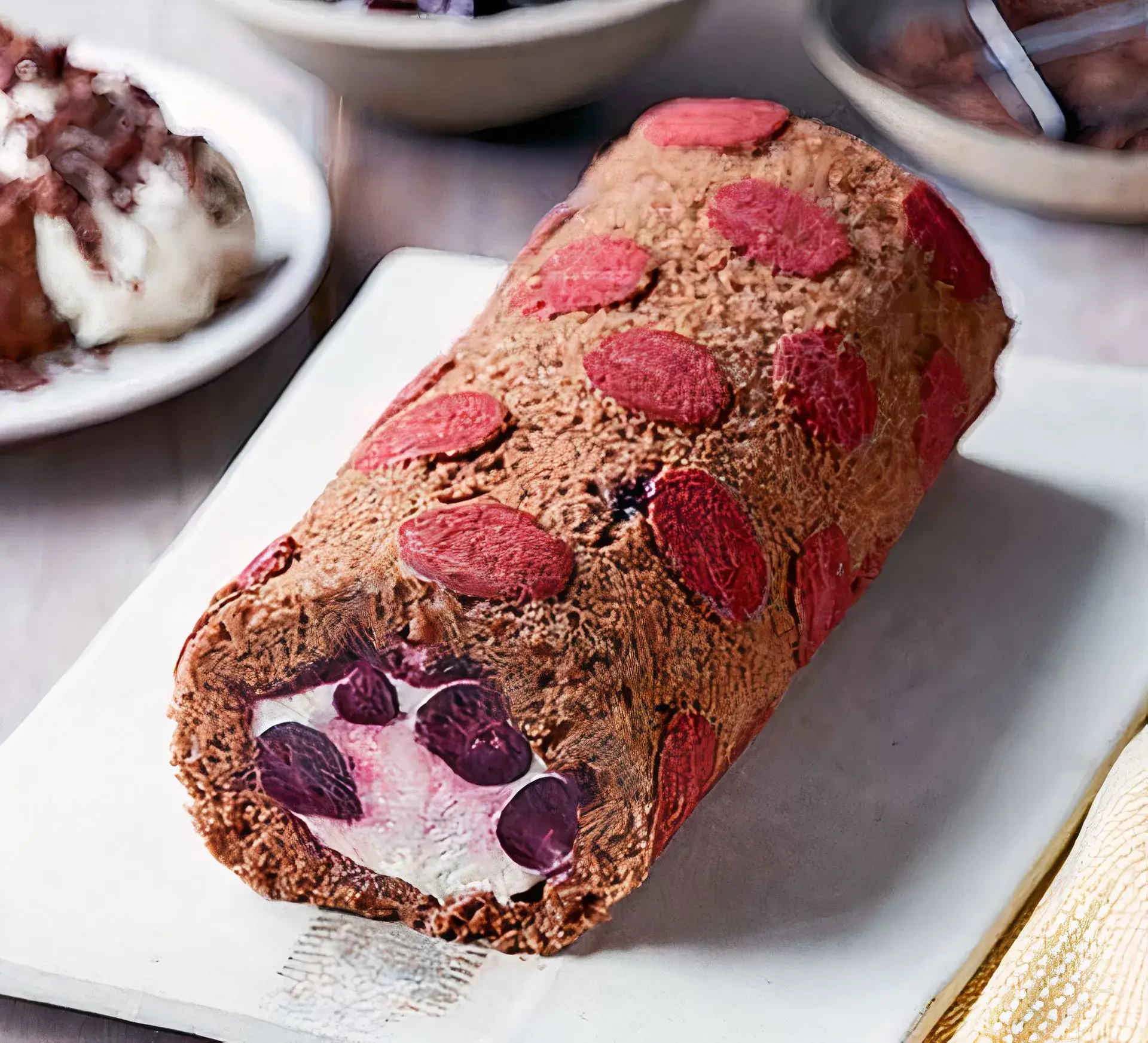 Tomuhle říkáme velká cukrářská fúze! Spojili jsme hned tři oblíbené dezerty – dort Schwarzwald, piškotovou roládu a zmrzlinu. Vznikla hříšně skvělá a osvěžující Schwarzwaldská zmrzlinová roláda. Kombinace čokoládového piškotu, černých trešní a smetanové zmrzliny.
