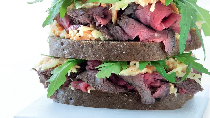 Zelný salát se dobře hodí k výraznému masu, jako je právě hovězí rostbíf. Nechcete-li se zdržovat jeho přípravou, zprudka opečte vysoký plátek osolené a opepřené roštěnky, zabalte ho do alobalu a nechte vychladnout. Pak nakrájejte na tenké proužky.