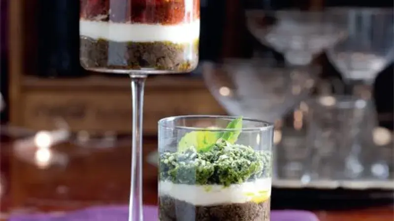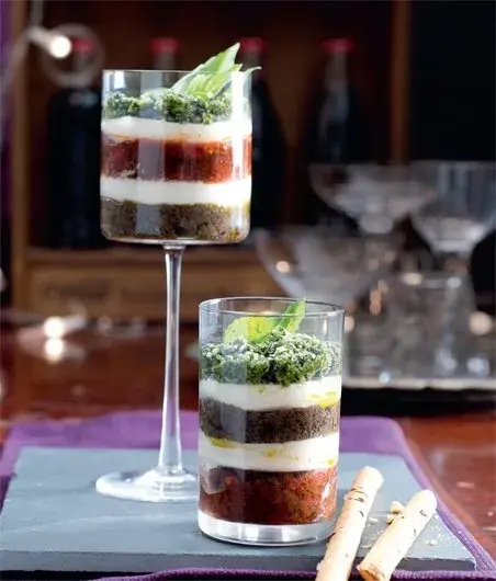 Silné chutě v těchto skleničkách mírní smetanově hebká mozzarella. Doporučujeme podávat s lehkým pečivem nebo s tyčinkami.