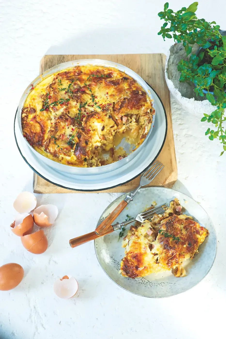 Mazanec naslano? A proč ne! Mazanec je podobný briošce a se sýrem a šunkou mu to sluší. Zapečte ho ve formě slaného nákypu a uvidíte, jak si královsky pochutnáte.