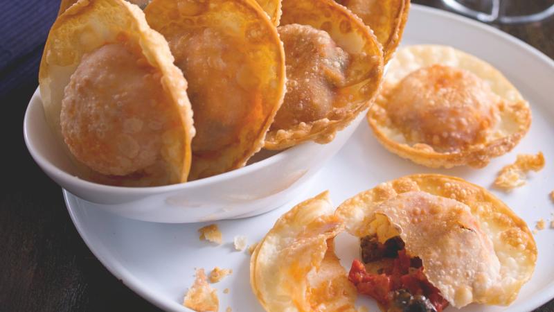 Raviolky jsou absolutní hit, křupou jako brambůrky, ale mají v sobě náplň, která tak trochu supluje dip. Jsou skvělé ještě horké, ale nemusíte se bát nechat je vychladnout.