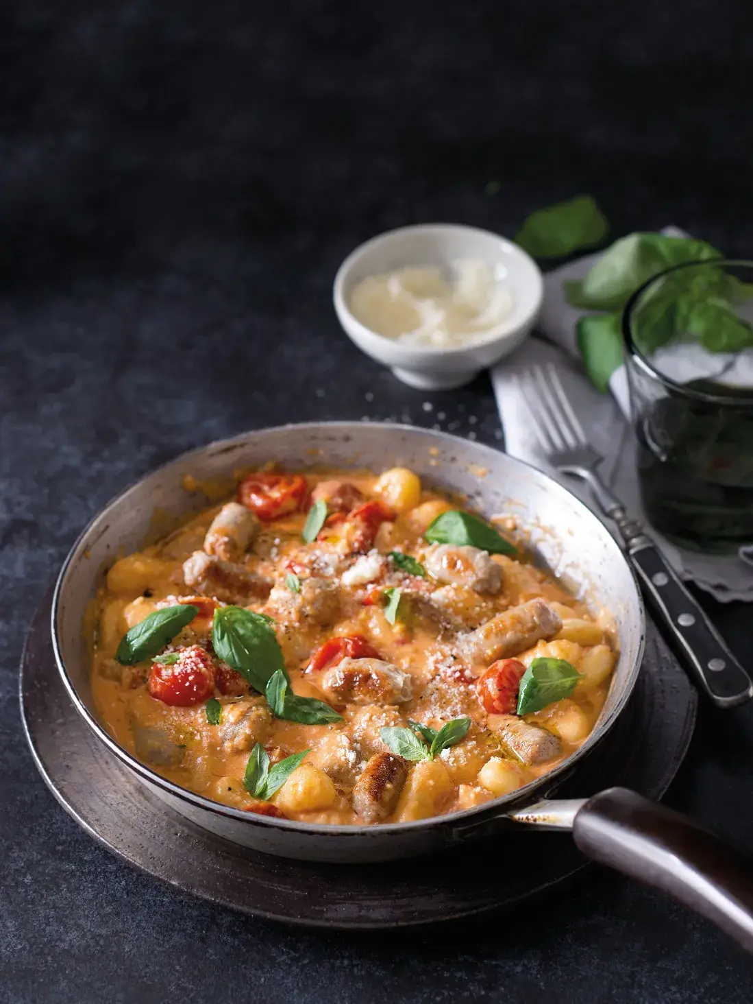 Noky, klobásky a smetanová rajčatová omáčka? Tohle si nenecháme ujít, prakticky už sedíme u stolu. Noky do tohoto jídla není vůbec potřeba předvářet, protože se uvaří přímo v omáčce. Díky tomu při vaření zašpiníte jen jedinou pánev!