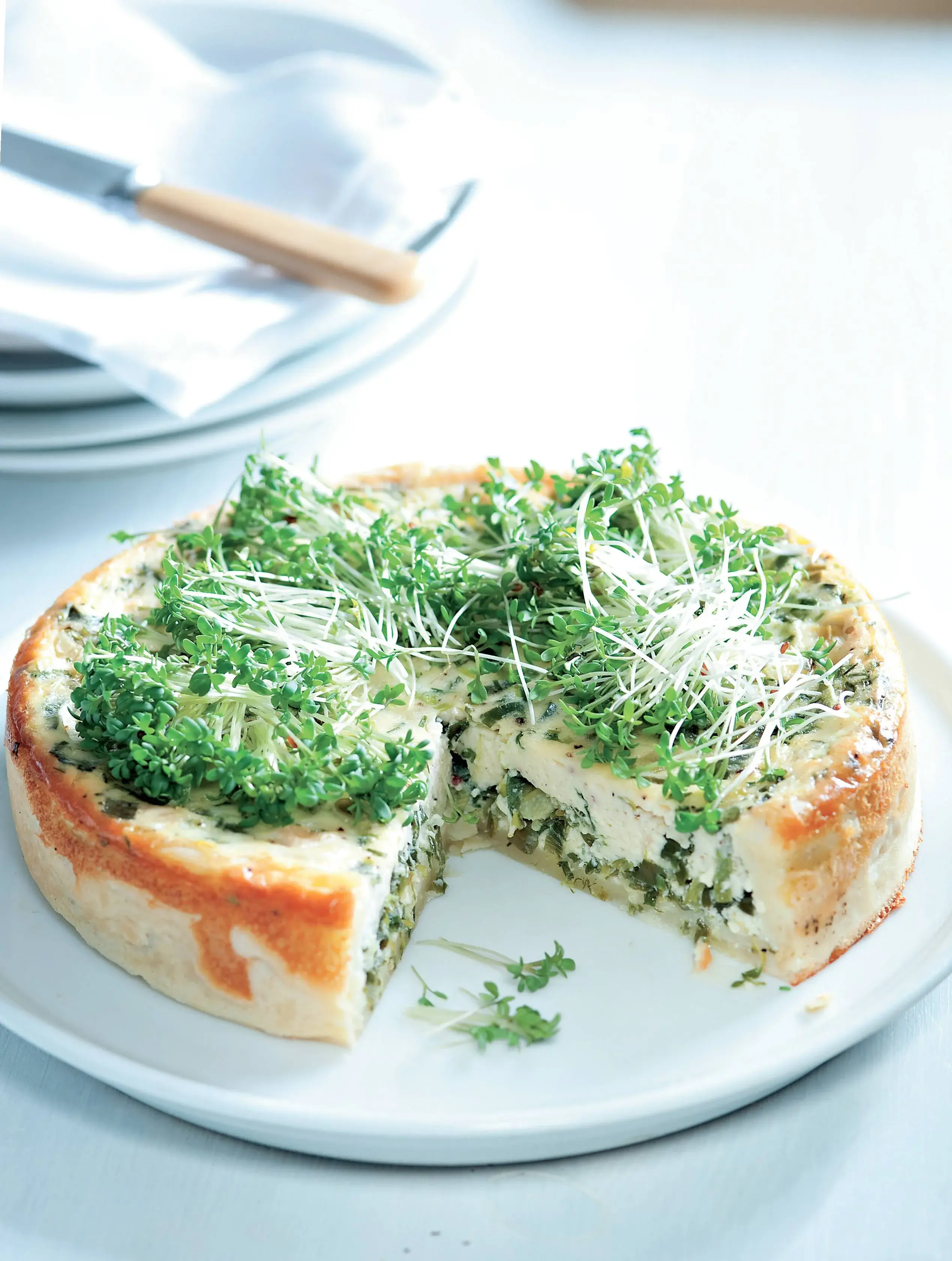 Spousta pažitky a mladé lístky řeřichy dodají koláči ze smetany a sýra nejen skvělou chuť, ale i krásu. Prostě k nakousnutí .
