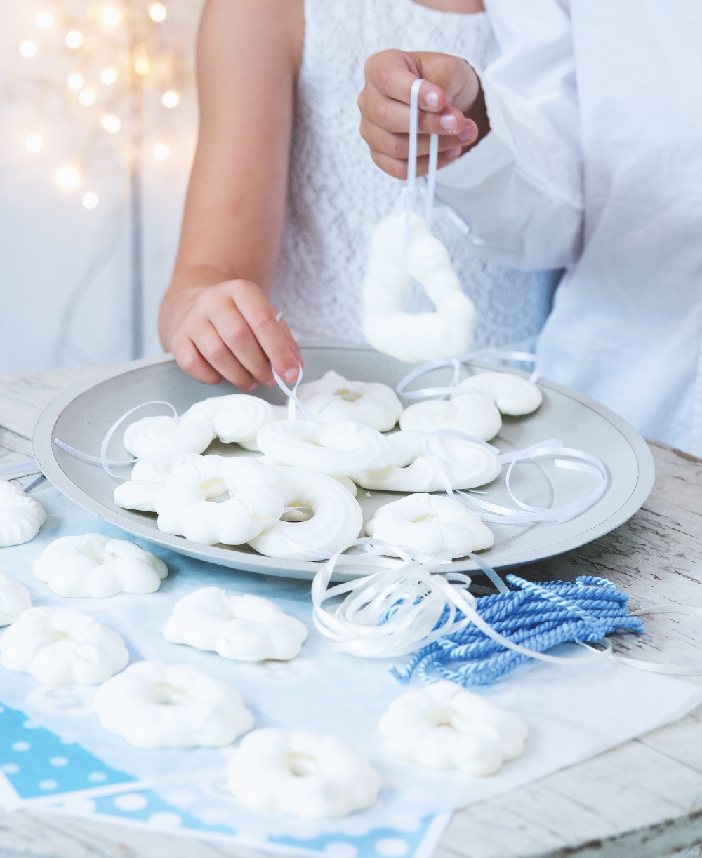 Z bílkového sněhu můžete vytvořit ty nejúžasnější (a nejroztodivnější) vánoční ozdoby. Jsou lehké, takže je můžete navěsit nejen na stromeček, ale třeba i na provázek do okna. A když nějaká spadne a rozbije se? Nevadí, alespoň ji můžete beztrestně sníst!