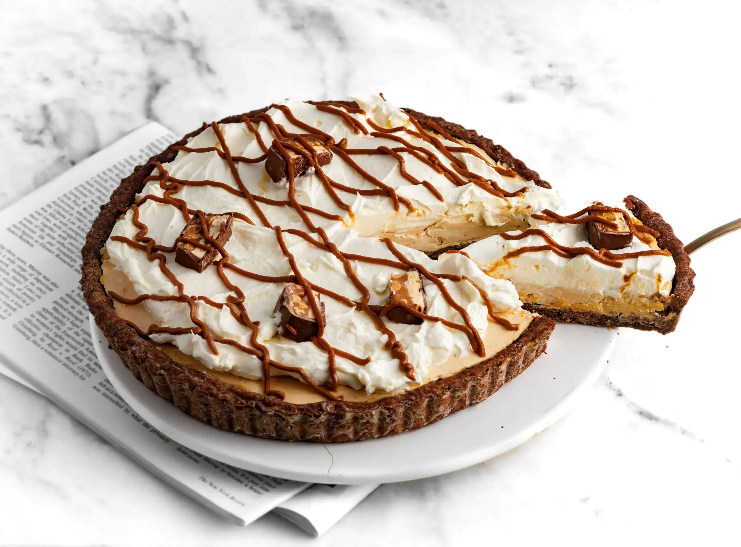 Snickers koláč je lahodný nepečený dezert připomínající oblíbenou tyčinku. Spodní část tvoří korpus z čokoládových sušenek a karamelový krém. Vršek tvoří čepice z nadýchané šlehačky zdobené karamelem. Díky ní dezert nejen skvěle chutná, ale také vypadá slavnostně a výjimečně.