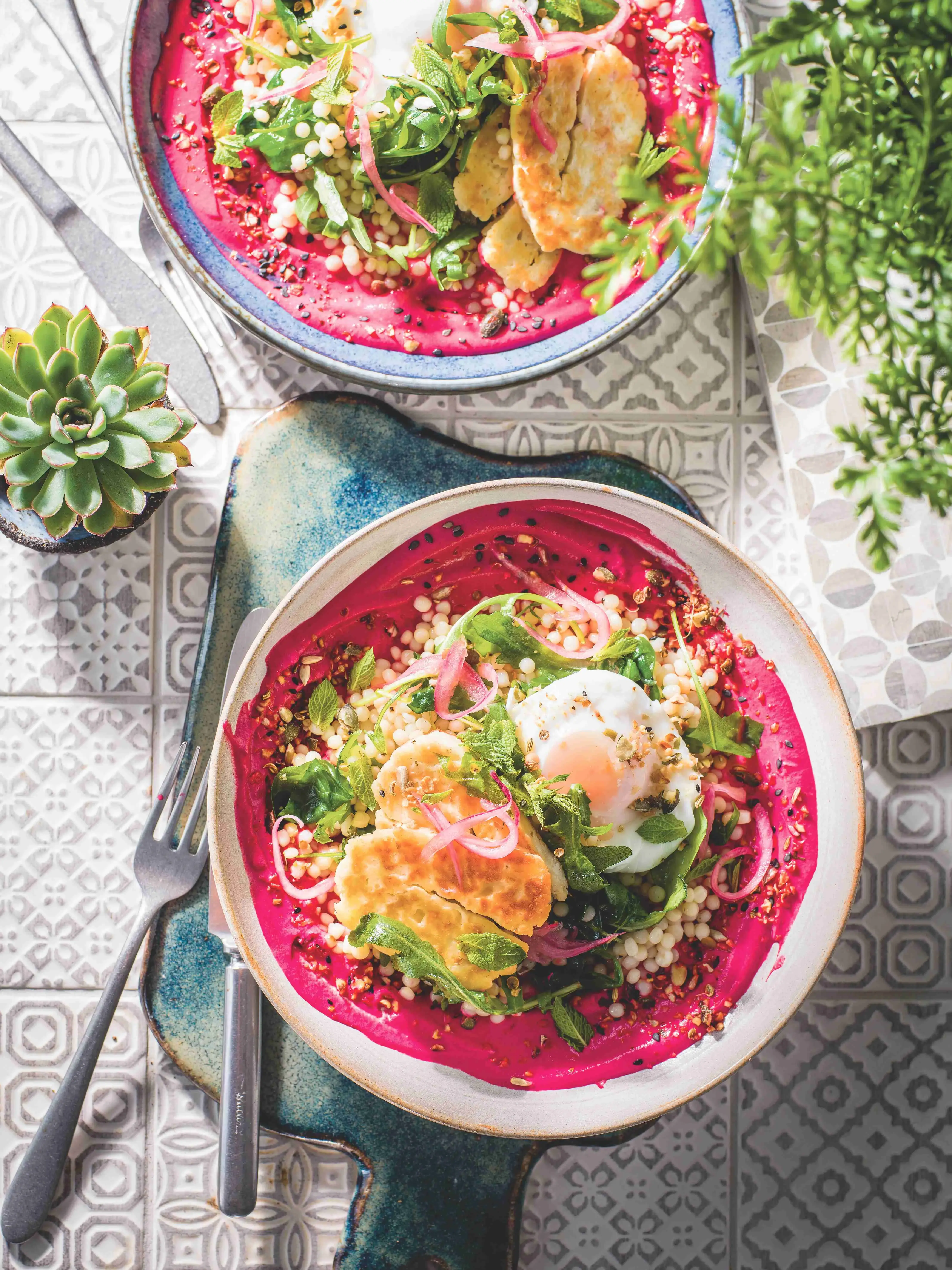 Salát k snídani se může jevit jako příliš dietní nápad – tenhle je výživný díky kuskusu, vejcím a sýru. Překvapí i kombinací chutí: základem je íránský jogurtový dip borani s červenou řepou a křupavá kořenicí směs dukkah.