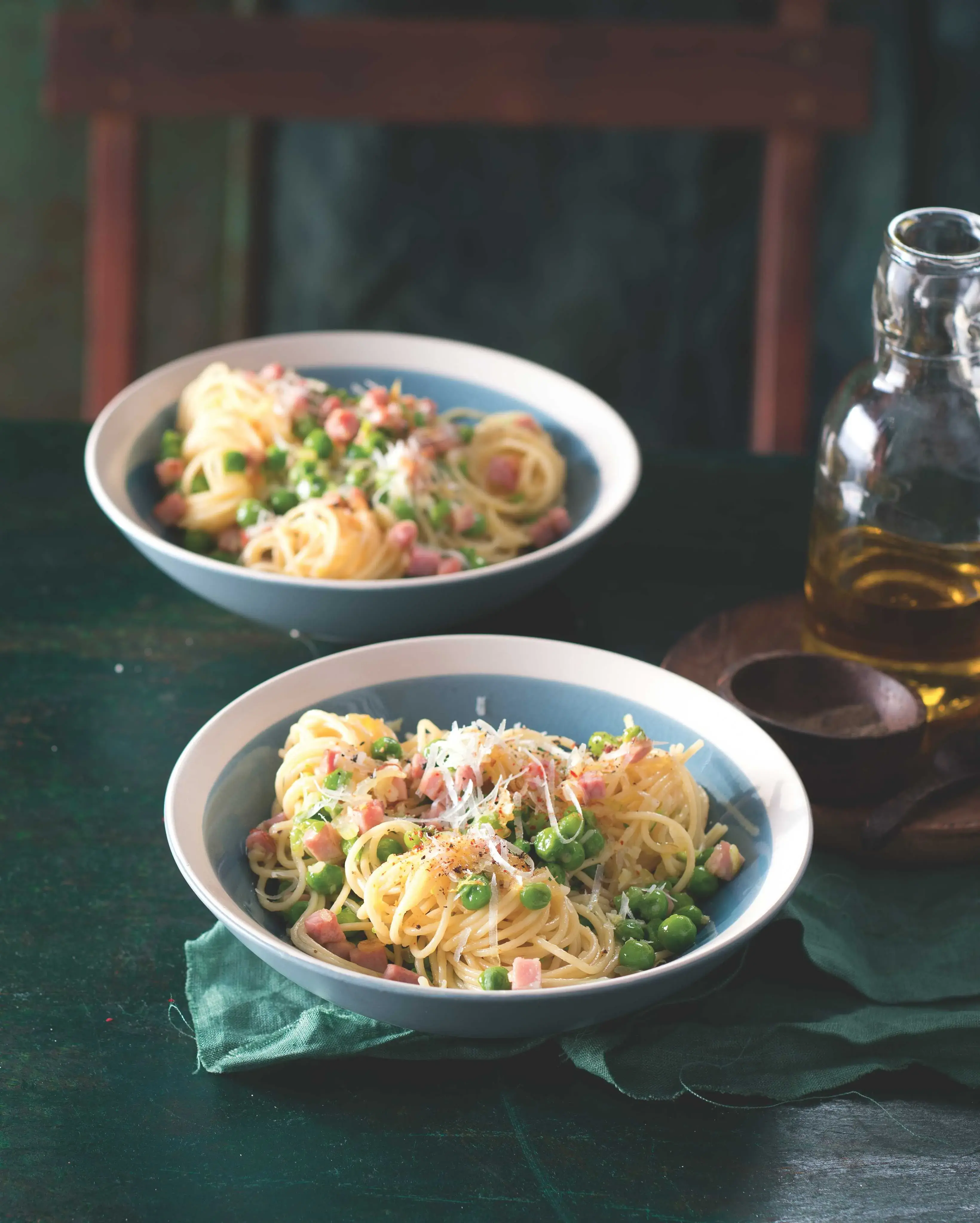 Hrášek plus šunka – a taky smetana – ladí nejen v polévce! Mražený hrášek je sázka na jistotu, ale v sezoně, jako právě teď, můžete použít i čerstvý.
