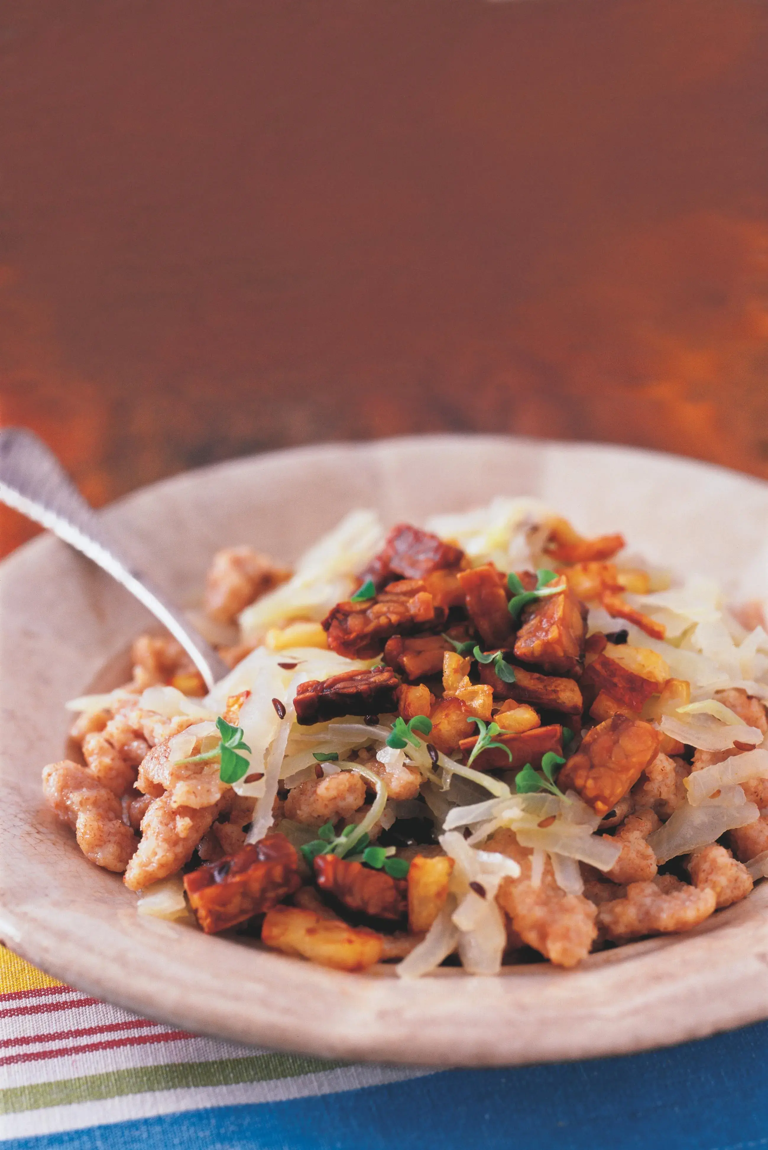 Tohle stoprocentně zdravé biojídlo je přímo nabité senzačními chutěmi. Uzený tempeh (lisovaný sójový tvaroh) nahradí špek – a výrazná chuť špaldové mouky dodá haluškám nový půvab.