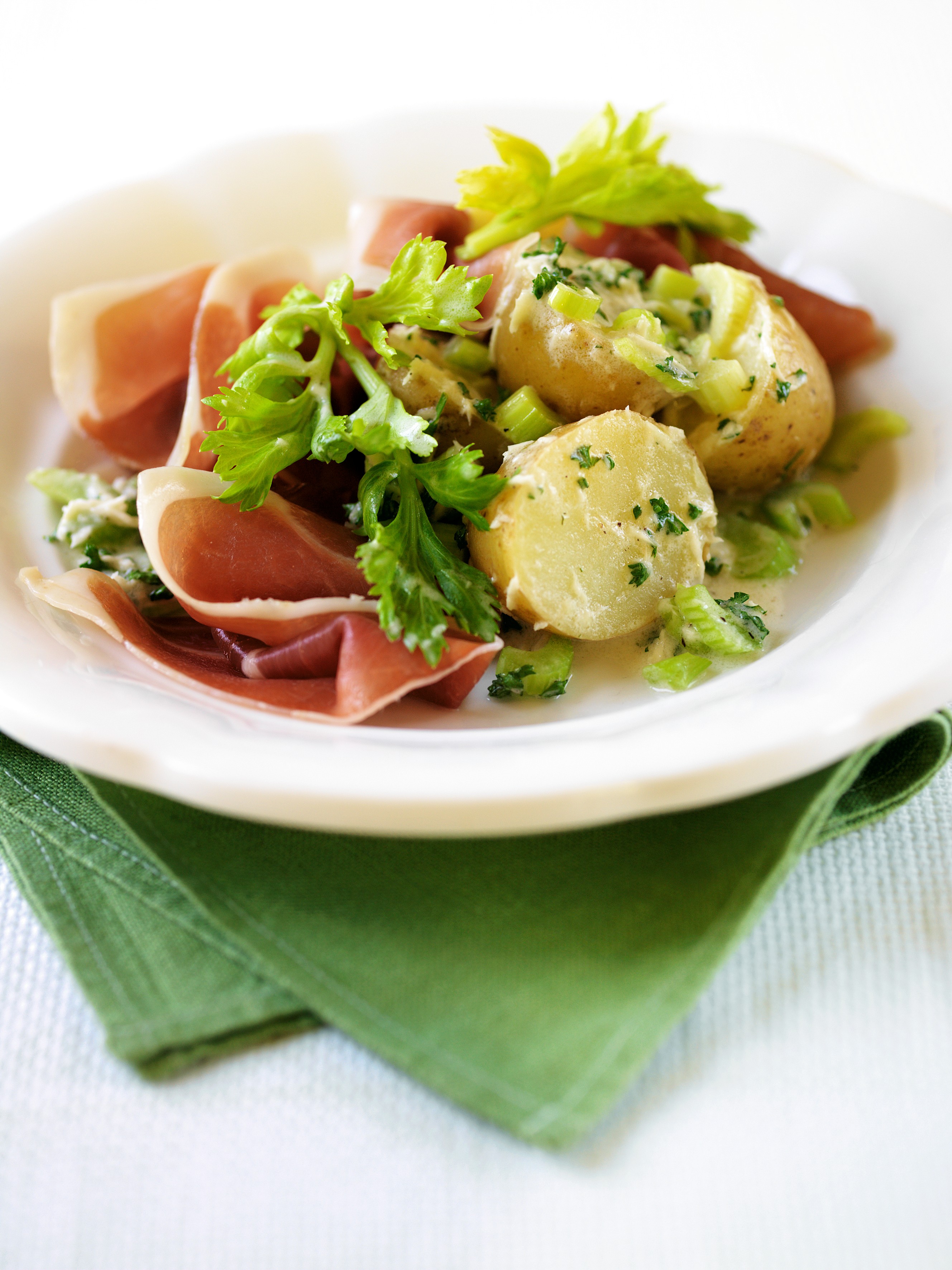 Tahle šunka je lahůdková sama o sobě, proto není třeba komplikovaného doprovodu. Nicméně jemné nové brambory s voňavou zálivkou jsou důstojným doplňkem v tomto zajímavém ‚salátu‘. Můžete ho podávat jako předkrm, chuťovku i samostatné lehké jídlo.