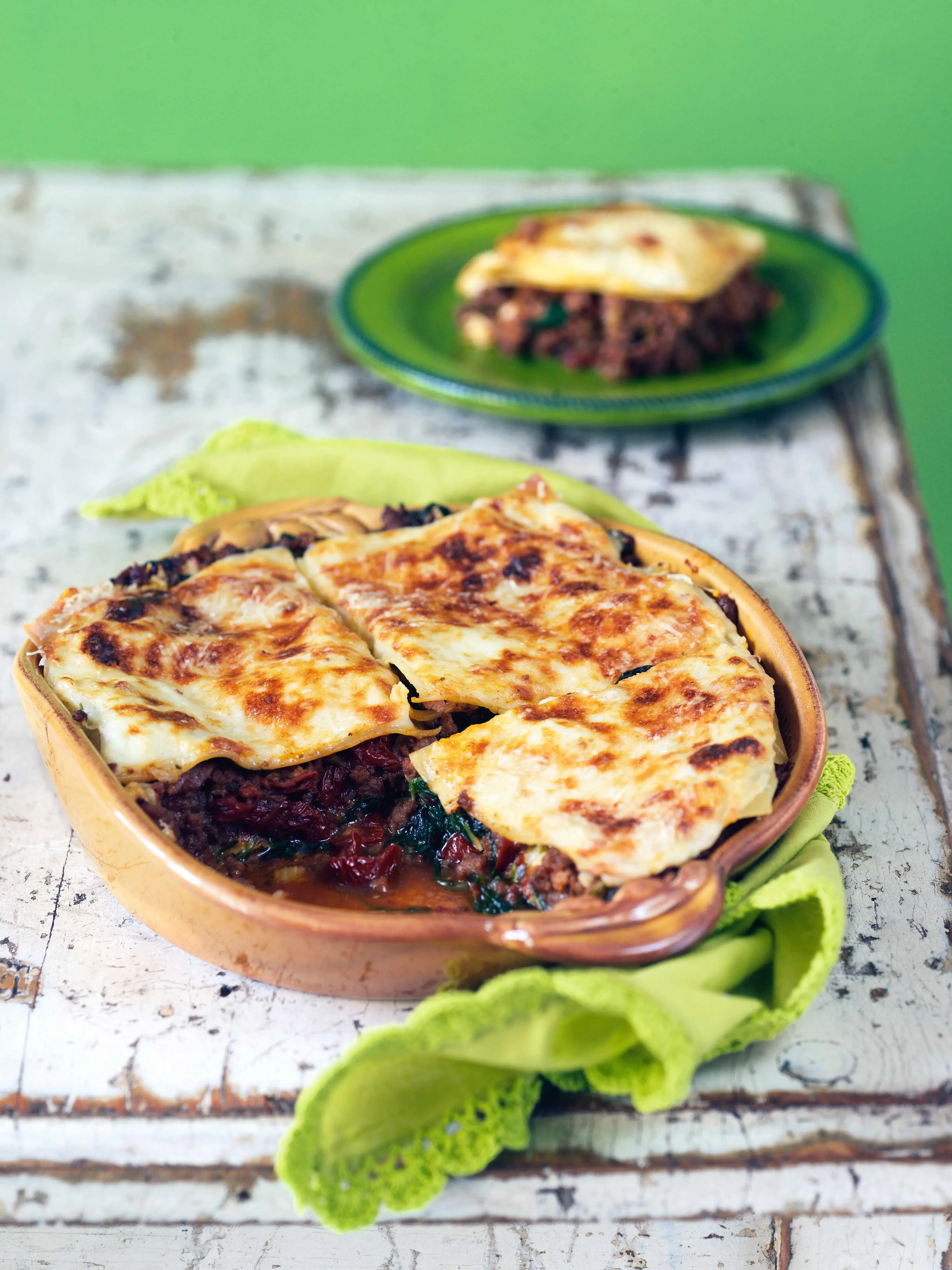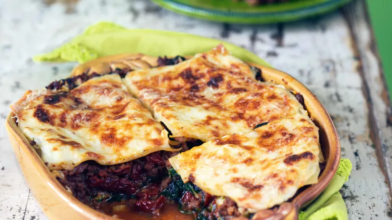 Lasagne doplněné špenátem a rajčaty, zvýrazněné chutí parmazánu.