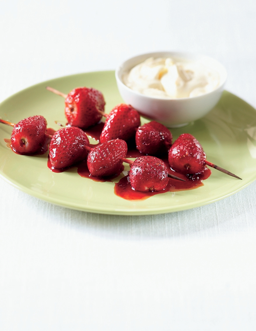Delikátní orinální dezert v podobě jahodových špízů potěší vaše smysly nejen na grilovací party.