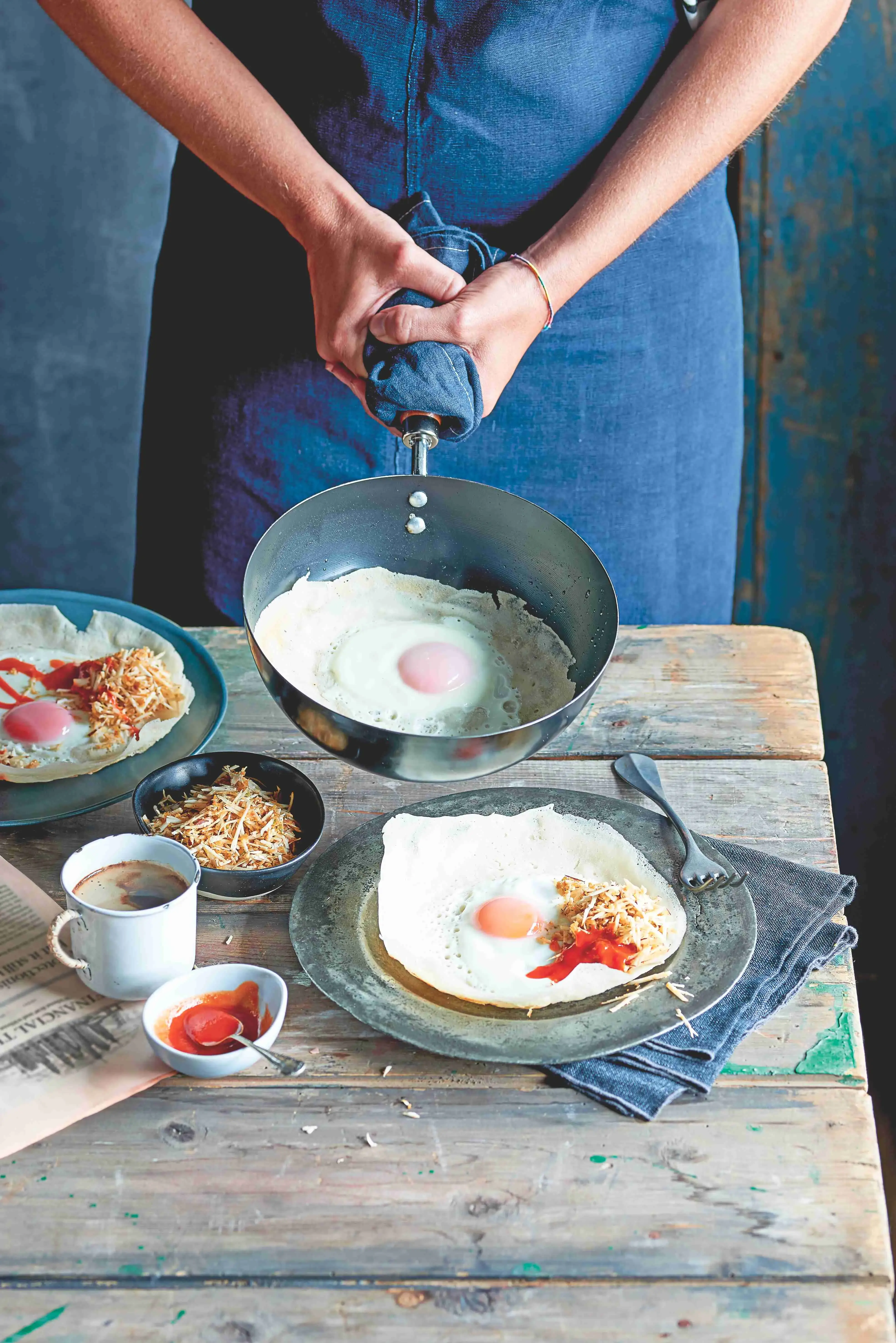 Snídaně jako na exotické dovolené! Palačinky ve tvaru mističky se jmenují hoppers a podávají se s pikantní kokosovou přílohou (pol sambol).