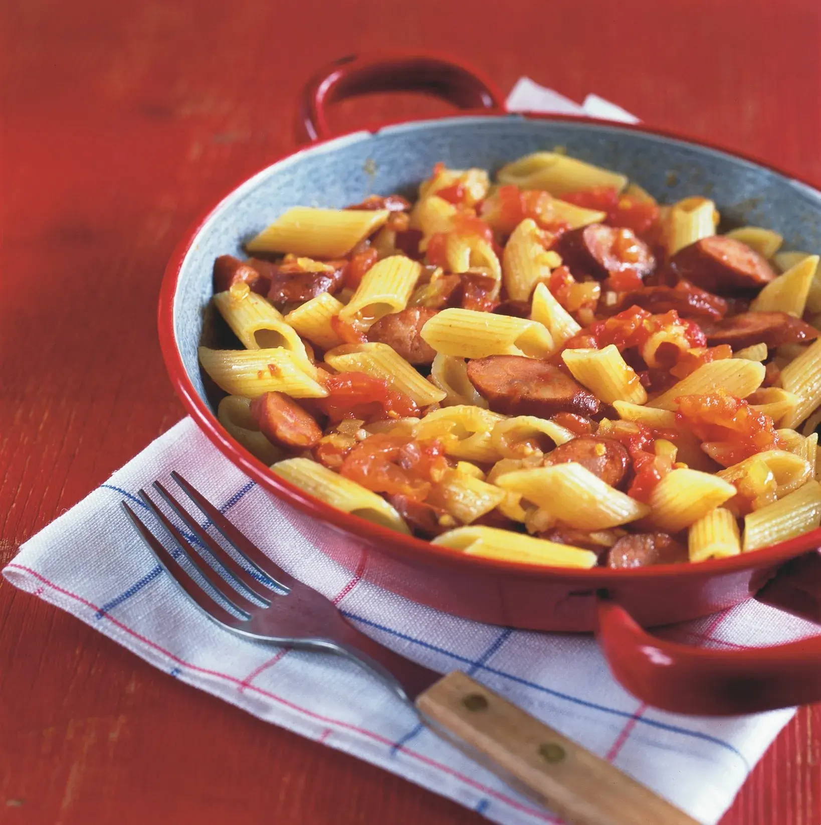 Skvělý nápad, jak zahnat půlnoční hlad! Má jenom jedno úskalí – vůně klobásky zaručeně přivolá ostatní spolubydlící, a tak hrozí, že se kolejní party protáhne až do rána… Šťavnaté těstoviny s klobáskou jsou hotové za pár minut a natolik jednoduchý recept, že ho zvládne určitě každý.