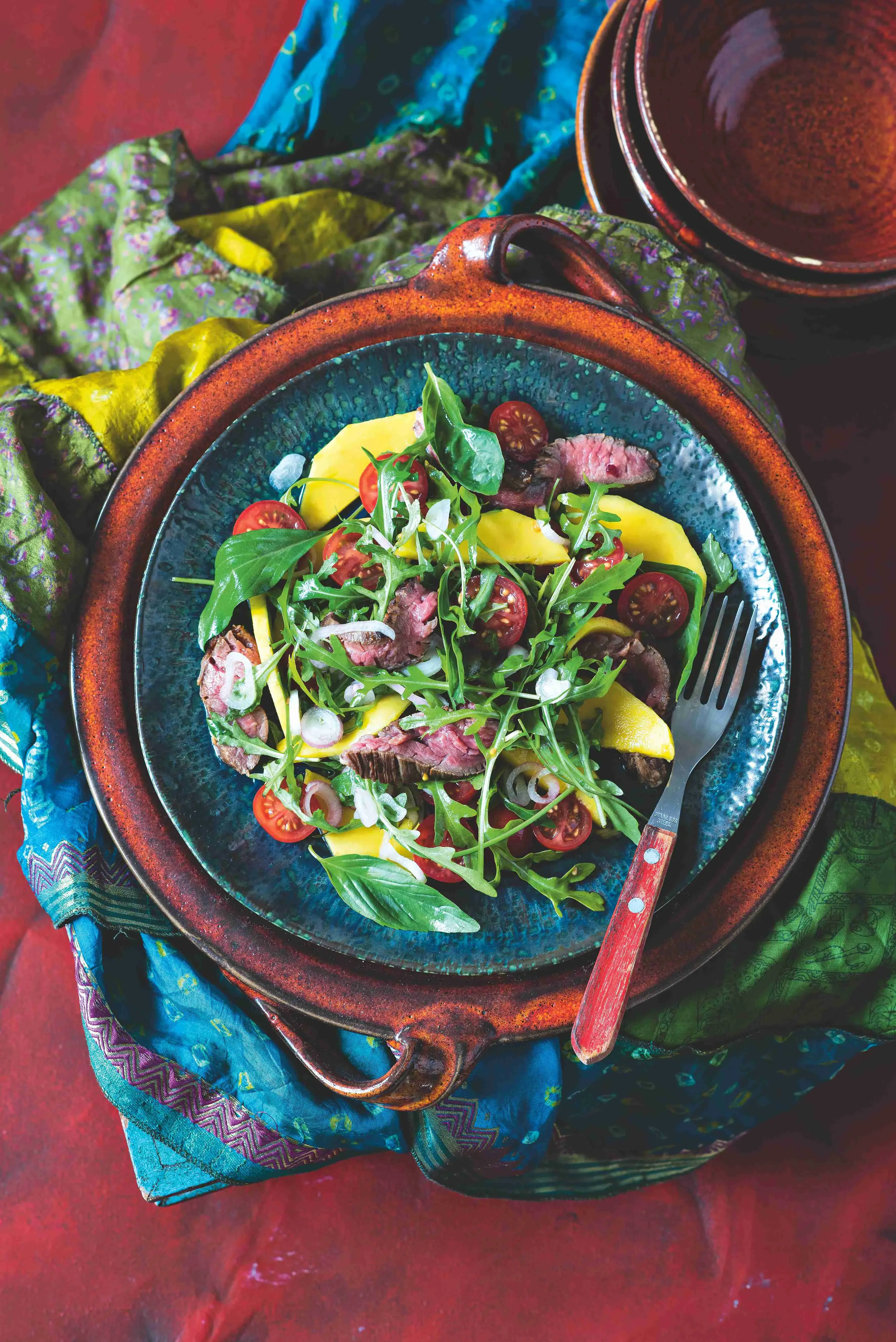 Jednoduchý salát, který stojí na surovinách: šťavnatých rajčatech, dokonale zralém mangu a kvalitním vyzrálém hovězím mase.