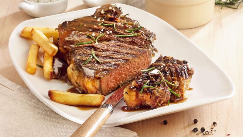 Skvělou přílohou ke steaku jsou i opékané bramborové plátky, grilovaná kukuřice a koriandrový dip. Ve slupce uvaříme 600 g mladých brambor. Do vroucí osolené vody vhodíme 2 klasy kukuřice, 15 minut vaříme a poté necháme okapat a osušíme. Brambory i kukuřici nakrájejíme na plátky silné asi 1,5 cm. V míse prohodíme se sušeným česnekem, solí a 40 ml olivového oleje. Vložíme do grilu Tefal OptiGrill+ XL rozpáleného na program zelenina. Pečeme dozlatova. Nakonec rozmícháme 200 g tučné zakysané smetany s hrstí nasekaného koriandrem a 2 stroužky česneku utřenými se solí. Podáváme ke steaku.