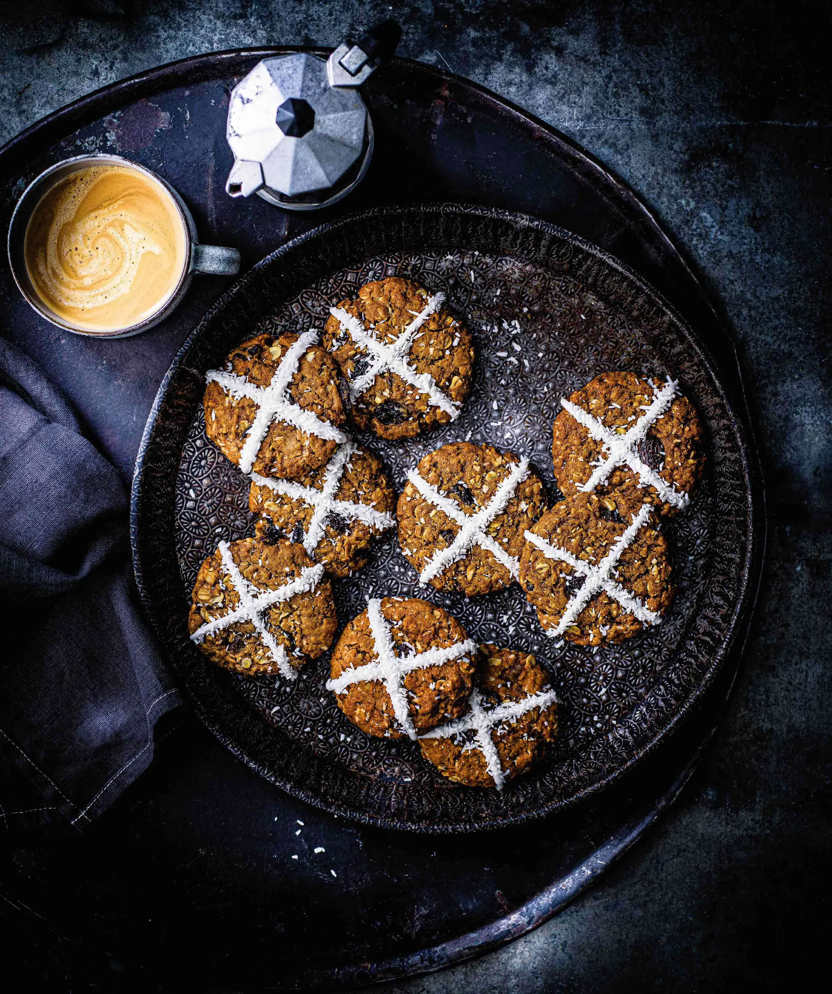 Upečte na Velikonoce voňavé kořeněné sušenky plné vloček a rozinek. Díky křížku z polevy budou připomínat tradiční britské hot cross buns, ovšem čas přípravy je sotva třetinový!