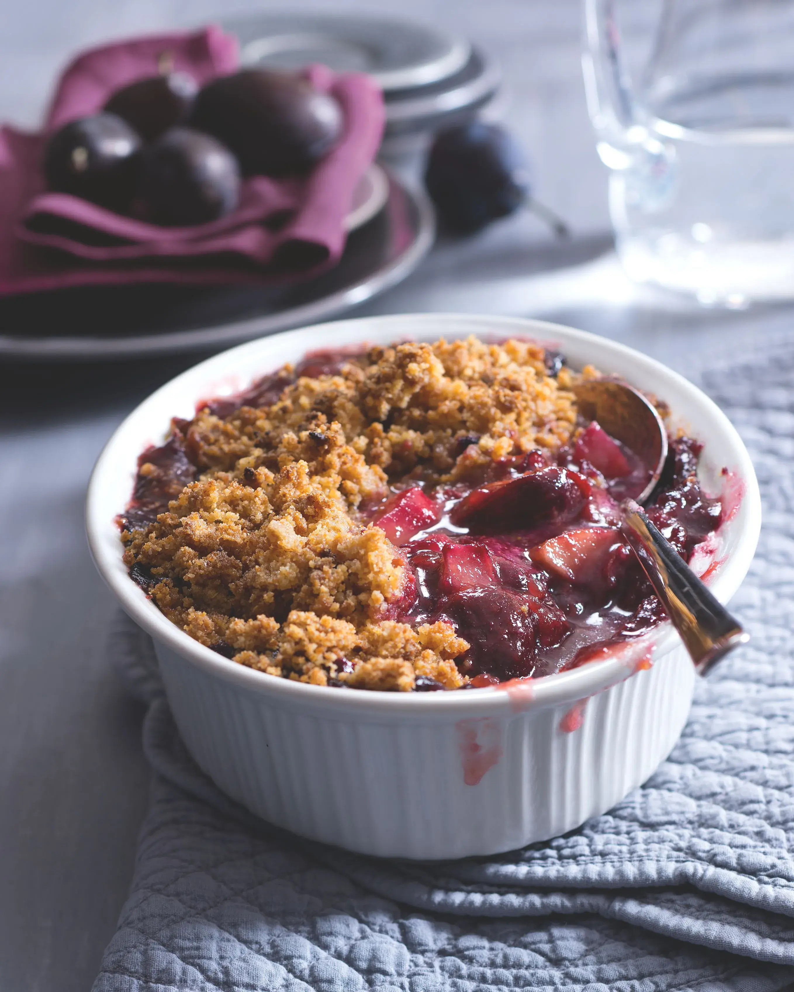 Krambl by měl ideálně obsahovat šťavnaté ovoce – nejlépe švestky či blumy. A navrchu křupavou drobenku. Přiznáváme, že crumble (jak se dezert v originálu píše) lze připravit i ve zdravější verzi, ale nás naprosto uchvátila tato s marcipánem a sušenkami. Pečené ovoce s křupavou krustou a zakysanou smetanou je fantastické spojení všeho, co máme rádi.