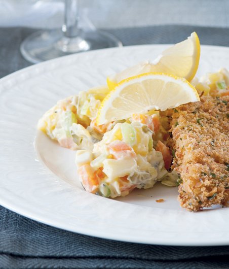Klasická varianta bramborového salátu s majonézou, které na svěžesti přidává řapíkatý celer.