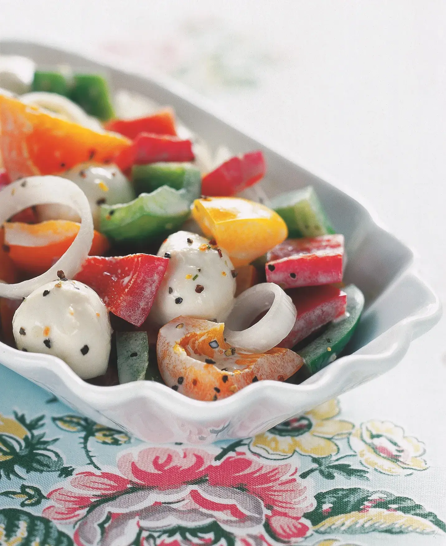 Papriky úžasně křupou a mozzarella získá v jemné, ale výrazné zálivce sytější chuť. Podíl jogurtu v zálivce odlehčí majonéze i svědomí.