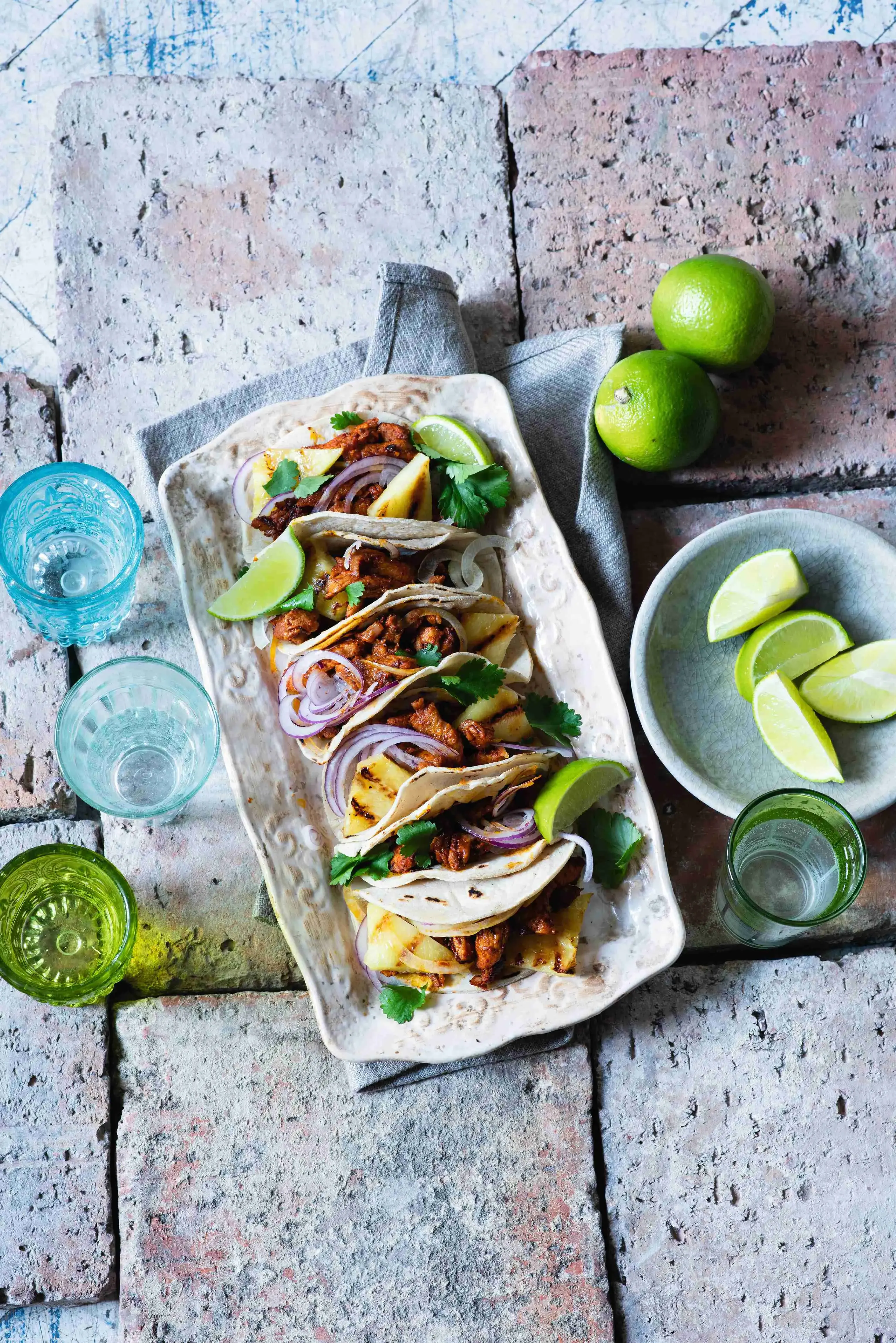 Tacos al pastor – grilované pikantní vepřové marinované v pastě achiote, pečený ananas a domácí tortillové placky: Tohle je pravá mexická fiesta, kterou můžete mít v létě na zahradě i v zimě doma v kuchyni. Bonus? Tortilly jsou zcela bezlepkové. Celý pokrm neobsahuje žádný lepek, laktózu, mléčnou bílkovinu, ani vejce, což jistě potěší řadu alergiků.