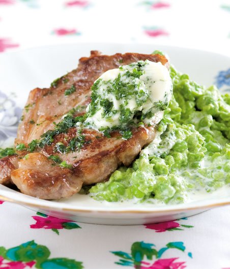 Hráškové pyré s mátou se skvěle doplňuje s mladým masem, navíc zjemněným máslem ochuceným bylinkami a citronovou šťávou.