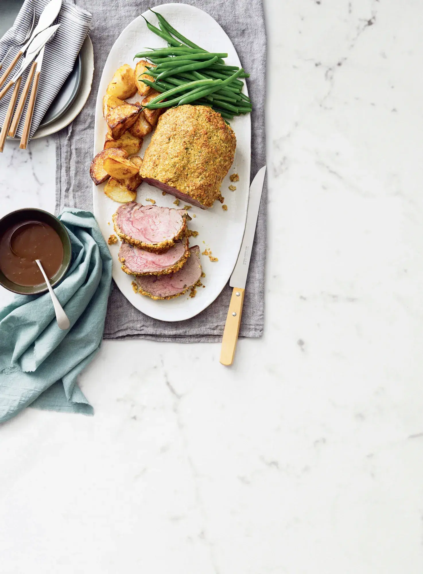 Pečínka obalená v oříškách a provoněná pomeranči je překvapivě lehká a svěží. Fazolky jsou v zimě příjemným osvěžením a pečené brambory jako příloha dostatečně zasytí. Luxusní oběd pro celou rodinu.