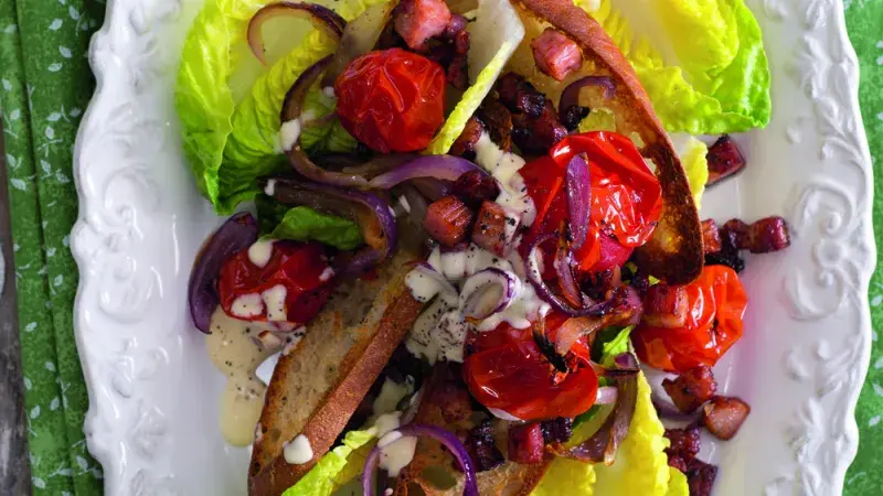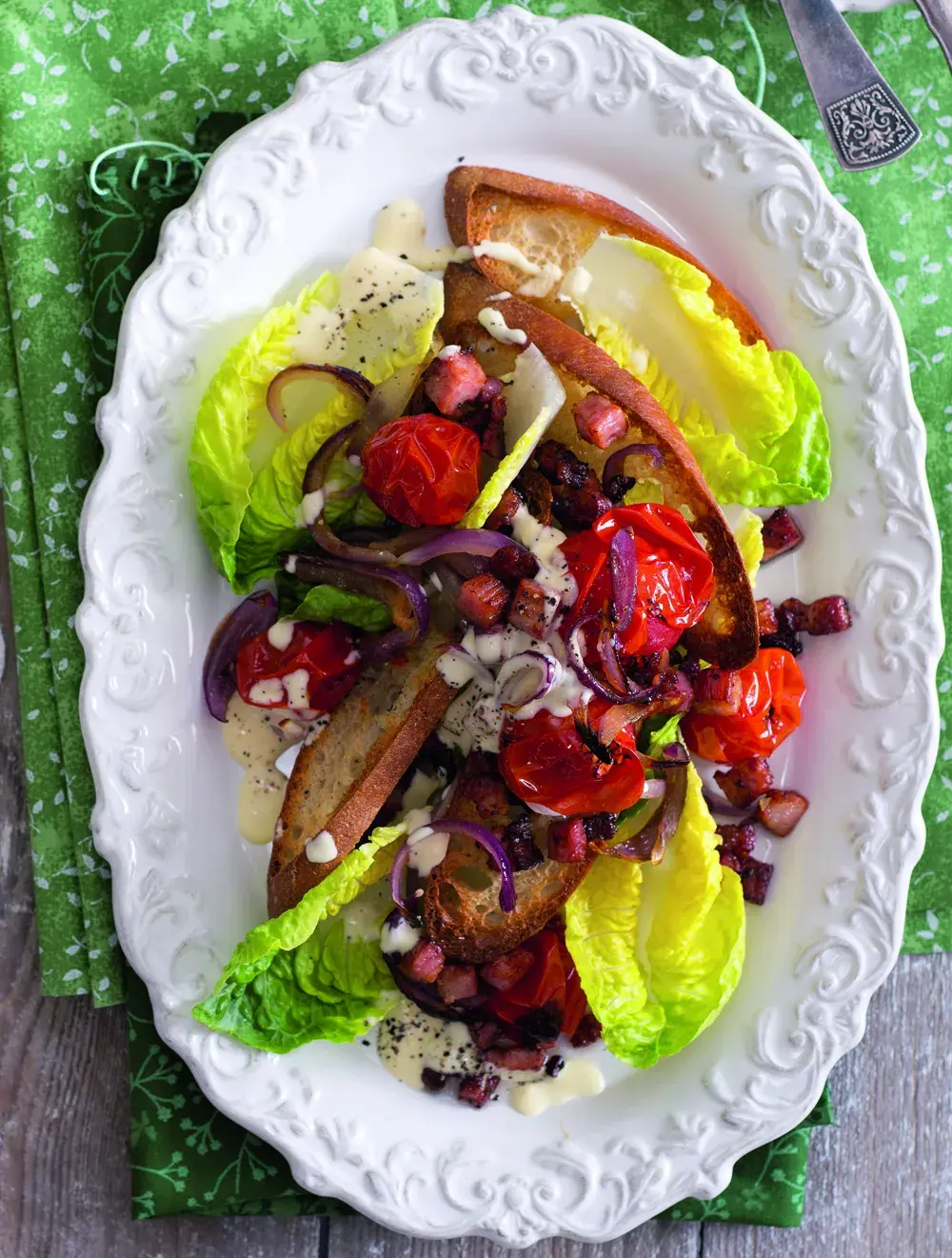 Když rozložíte klasický americký sendvič BLT (B jako bacon, L jako lettuce a T jako tomatoes), získáte tenhle superchutný salát.