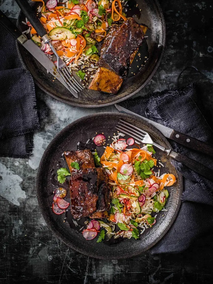 Existují dva druhy lidí – ti, kteří jedí žebírka spořádaně příborem, a pak ti, jež se nebojí zašpinit si ruce. Ať už patříte ke kterékoli skupině, ručíme za to, že na terijaki žebírcích si neskutečně pochutnáte. Rýže a nakládaná zelenina jen dokonale podpoří asijské vyznění pokrmu.