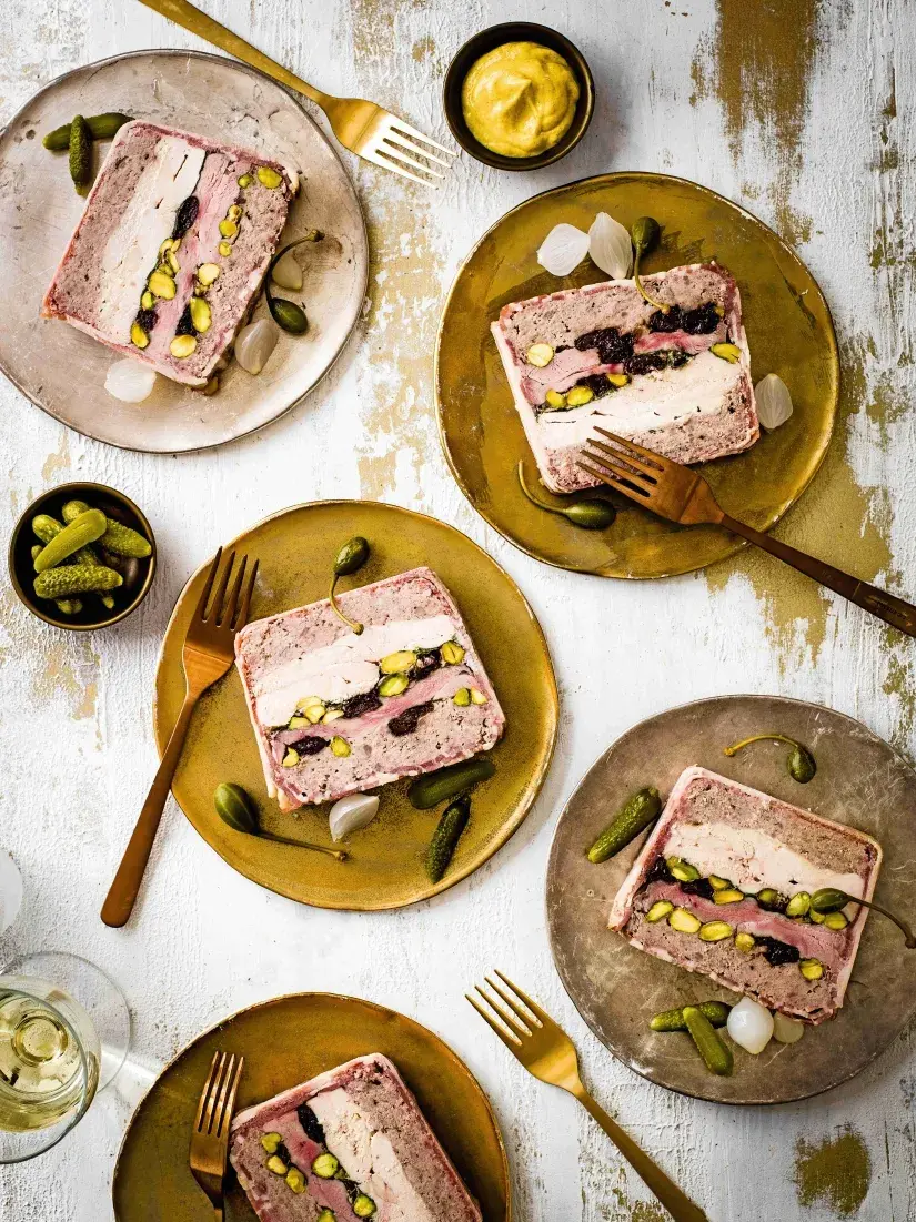 Terinky jsou na předkrm skvělé z mnoha důvodů: dají se pohodlně udělat až dva dny dopředu, podávat je můžete teplé i studené a hlavně – na řezu a při servírování vypadají nesmírně elegantně. Efektní vrstvení kachního, kuřecího a hovězího masa, brusinek a pistácií vyrazí hostům dech.