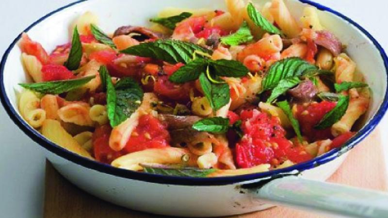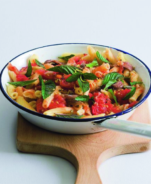 Uvařte těstoviny a přidejte základní rajčatovou omáčku. Zajímavou chuť dotvoří kombinace ančoviček, máty a citronové kůry.