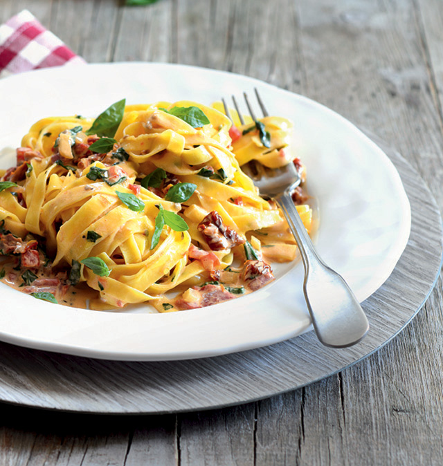 Sušená rajčata – obzvláště třeba ta z Itálie – jsou opravdu výrazná, a proto pasují jen do některých pokrmů. Kombinace s pečenou paprikou a smetanou jim ale vysloveně sedne! Těstoviny s krémovou omáčkou s paprikami a sušenými rajčaty je perfektní bezmasé jídlo, jako stvořené pro romantickou večeři ve dvou. Pak už jen stačí otevřít láhev vína.